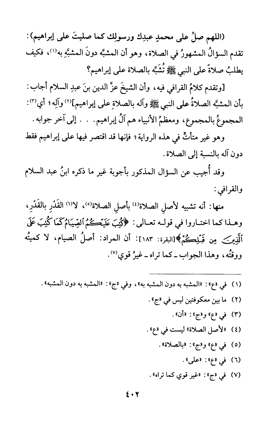 [وتقدم كلامُ القرافي فيه، وأن الشيخَ عزَّ الدين بنَ عبدِ السلام أجاب: بأن المشبَّه الصلاةُ على النبي - صلى الله عليه وسلم - وآله بالصلاةِ على إبراهيم] (¬2) وآلِه؛ أي (¬3): المجموعُ بالمجموع، ومعظمُ الأنبياء هم آلُ إبراهيم ... إلى آخر جوابه.