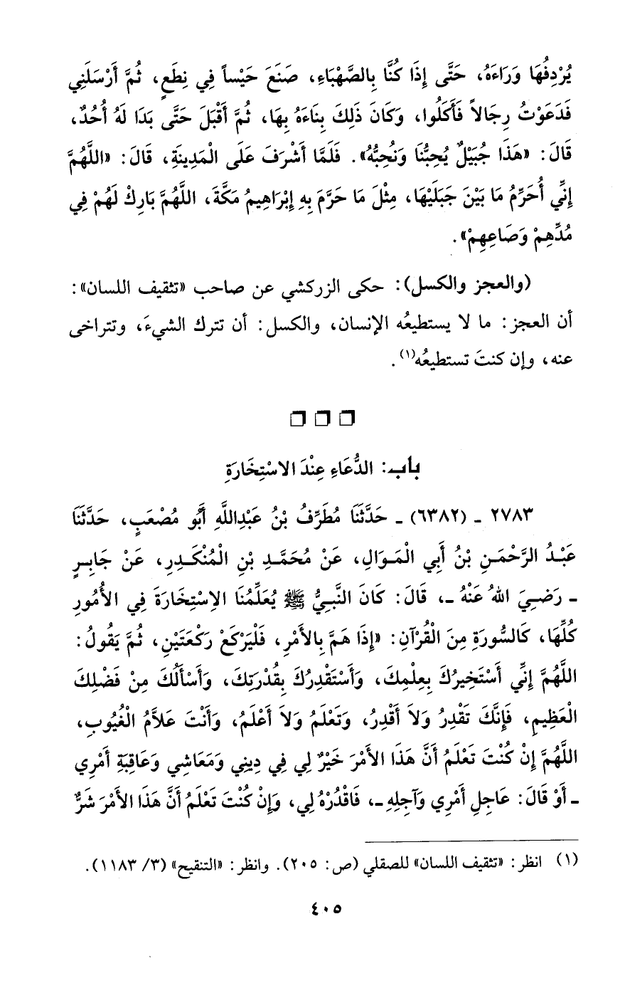 2783 - (6382) - حَدَّثَنَا مُطَرِّفُ بْنُ عَبْدِ اللَّهِ أبَو مُصْعَبٍ، حَدَّثَنَا عَبْدُ الرَّحْمَنِ بْنُ أِبي الْمَوَالِ، عَنْ مُحَمَّدِ بْنِ الْمُنْكَدِرِ، عَنْ جَابِرٍ - رَضِيَ اللهُ عَنْهُ -، قَالَ: كَانَ النَّبِيُّ - صلى الله عليه وسلم - يُعَلِّمُنَا الاِسْتِخَارَةَ فِي الأُمُورِ كُلَّهَا، كَالسُّورَةِ مِنَ الْقُرْآنِ: "إِذَا هَمَّ بِالأَمْرِ، فَلْيَرْكَعْ رَكْعَتَيْنِ، ثُمَّ يَقُولُ: اللَّهُمَّ إِنَّي أَسْتَخِيرُكَ بِعِلْمِكَ، وَأَسْتَقْدِرُكَ بِقُدْرتكَ، وَأَسْألكَ مِنْ فَضْلِكَ الْعَظِيم، فَإنَّكَ تَقْدِرُ وَلاَ أَقْدِرُ، وَتعلَمُ وَلاَ أَعلَمُ، وَأَنْتَ عَلاَّمُ الْغُيُوبِ، اللَّهُمَّ إِنْ كُنْتَ تَعلَمُ أَنَّ هذَا الأَمْرَ خَيْرٌ لِي فِي دِيني وَمَعَاشي وَعَاقِبَةِ أَمْرِي - أَوْ قَالَ: عَاجِلِ أَمْرِي وَآجِلِهِ -، فَاقْدُرهُ لِي، وَإِنْ كُنْتَ تَعلَمُ أَنَّ هذَا الأَمرَ شَرٌّ