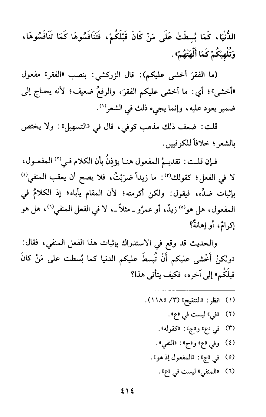 (ما الفقرَ أخشى عليكم): قال الزركشي: بنصب "الفقر" مفعول "أخشى"؛ أي: ما أخشى عليكم الفقرَ، والرفعُ ضعيف؛ لأنه يحتاج إلى ضمير يعود عليه، وإنما يجيء ذلك في الشعر (¬1).