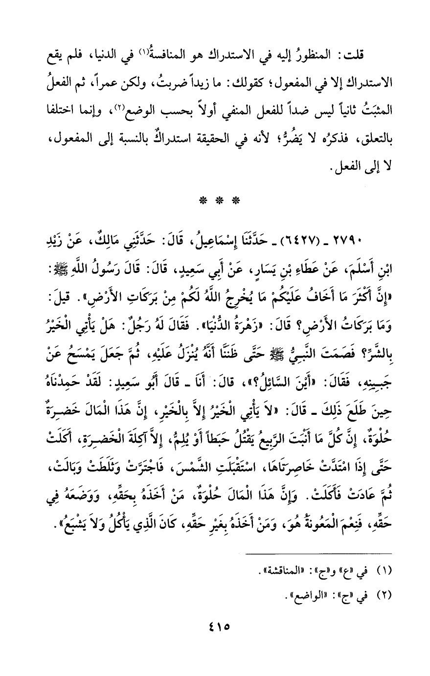 2790 - (6427) - حَدَّثَنَا إِسْمَاعِيلُ، قَالَ: حَدَّثَنِي مَالِكٌ، عَنْ زَيْدِ ابْنِ أَسْلَمَ، عَنْ عَطَاءِ بْنِ يَسَارٍ، عَنْ أَبِي سَعِيدٍ، قَالَ: قَالَ رَسُولُ اللَّهِ - صلى الله عليه وسلم -: "إِنَّ أَكْثَرَ مَا أَخَافُ عَلَيْكُمْ مَا يُخْرِجُ اللَّهُ لَكُم مِنْ بَرَكَاتِ الأَرْضِ". قيلَ: وَمَا بَرَكَاتُ الأَرْضِ؟ قَالَ: "زَهْرَةُ الدُّنْيَا". فَقَالَ لَهُ رَجُلٌ: هَلْ يَأْتِي الْخَيْرُ بِالشَّرِّ؟ فَصَمَتَ النَّبِيُّ - صلى الله عليه وسلم - حَتَّى ظَنَنَّا أَنَّهُ يُنْزَلُ عَلَيْهِ، ثُمَّ جَعَلَ يَمْسَحُ عَنْ جَبِينِهِ، فَقَالَ: "أَيْنَ السَّائِلُ؟ "، قالَ: أَنَا - قَالَ أَبُو سَعِيدٍ: لَقَدْ حَمِدْنَاهُ حِينَ طَلَعَ ذَلِكَ - قَالَ: "لاَ يَأْتِي الْخَيْرُ إِلاَّ بِالْخَيْرِ، إِنَّ هذَا الْمَالَ خَضِرَةٌ حُلْوَةٌ، إِنَّ كُلَّ مَا أَنْبَتَ الرَّبِيعُ يَقْتُلُ حَبَطاً أَوْ يُلِمُّ، إِلاَّ آكِلَةَ الْخَضِرَةِ، أَكَلَتْ حَتَّى إِذَا امتَدَّتْ خَاصِرَتَاهَا، اسْتَقْبَلَتِ الشَّمْسَ، فَاجْتَرَّتْ وَثَلَطَتْ وَبَالَتْ، ثُمَّ عَادَتْ فَأَكَلَتْ. وَإِنَّ هذَا الْمَالَ حُلْوَةٌ، مَنْ أَخَذَهُ بِحَقِّهِ، وَوَضَعَهُ فِي حَقَّهِ، فَنِعْمَ الْمَعُونَةُ هُوَ، وَمَنْ أَخَذَهُ بِغَيْرِ حَقِّهِ، كَانَ الَّذِي يَأْكُلُ وَلاَ يَشْبَعُ".