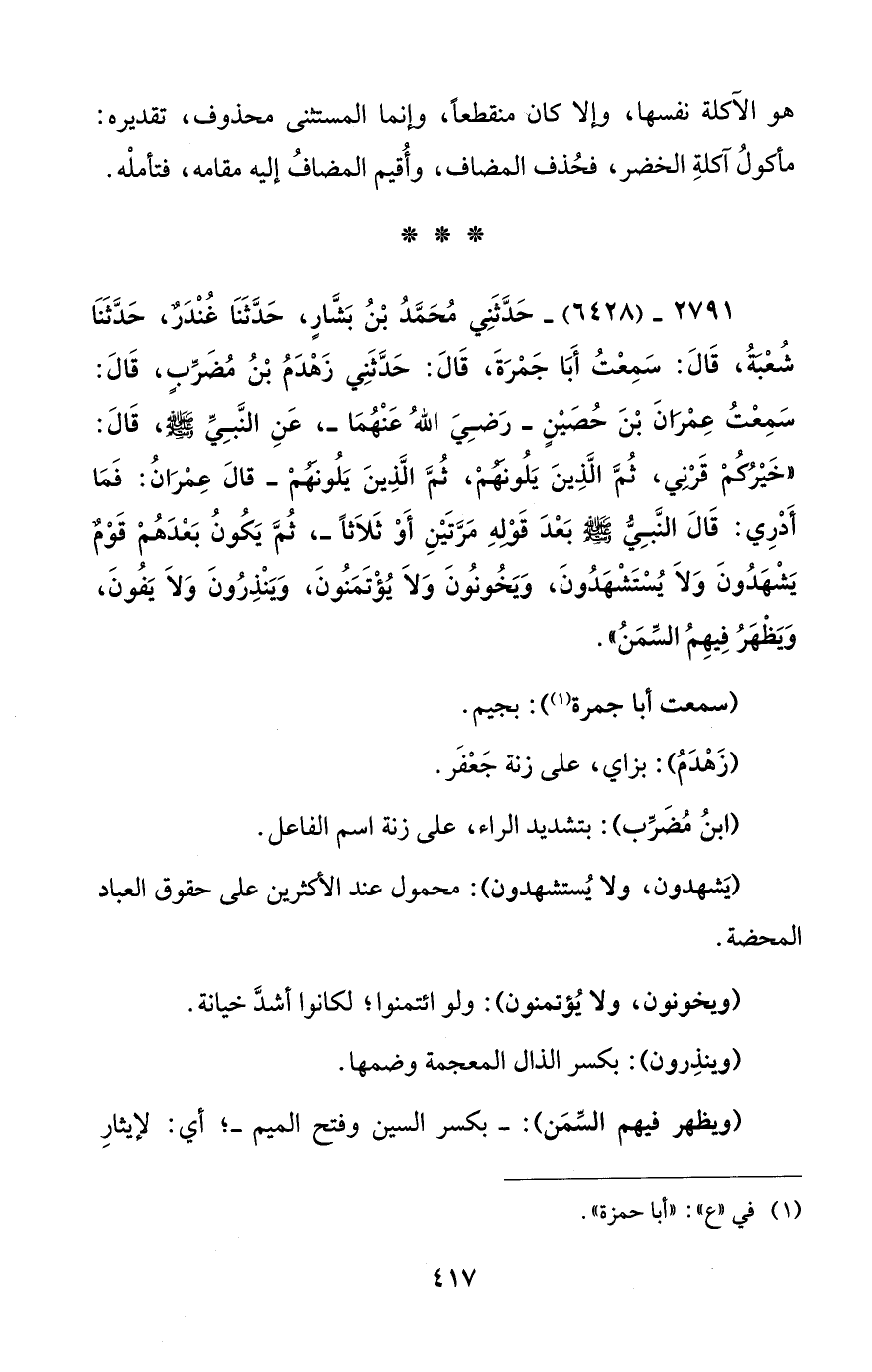 2791 - (6428) - حَدَّثَنِي مُحَمَّدُ بْنُ بَشَّارٍ، حَدَّثَنَا غُنْدَرٌ، حَدَّثَنَا شُعْبَةُ، قَالَ: سَمِعْتُ أَبَا جَمْرَةَ، قَالَ: حَدَّثَنِي زَهْدَمُ بْنُ مُضَرِّبٍ، قَالَ: سَمِعْتُ عِمْرَانَ بنَ حُصَيْنٍ - رَضِيَ اللهُ عَنْهُمَا -، عَنِ النَّبِيِّ - صلى الله عليه وسلم -، قَالَ: "خَيْرُكُمْ قَرْنِي، ثُمَّ الَّذِينَ يَلُونَهُمْ، ثُمَّ الَّذِينَ يَلُونَهُمْ - قالَ عِمْرَانُ: فَمَا أَدْرِي: قَالَ النَّبِيُّ - صلى الله عليه وسلم - بعدَ قَوْلهِ مَرَّتَيْنِ أَوْ ثَلاَثاً -، ثُمَّ يَكُونُ بَعدَهُمْ قَوْمٌ يَشْهَدُونَ وَلاَ يُسْتَشْهَدُونَ، وَيَخُونوُنَ وَلاَ يُؤْتَمَنُونَ، وَيَنْذِرُونَ وَلاَ يَفُونَ، وَيَظْهَرُ فِيهِمُ السِّمَنُ".