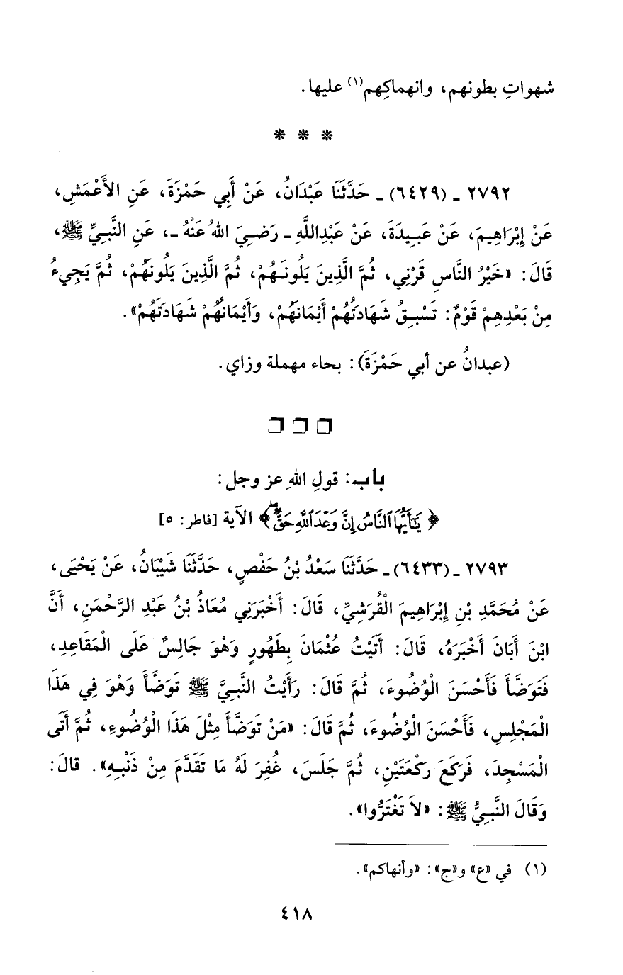 2792 - (6429) - حَدَّثَنَا عَبْدَانُ، عَنْ أَبِي حَمْزَةَ، عَنِ الأَعْمَشِ، عَنْ إِبْرَاهِيمَ، عَنْ عَبِيدَةَ، عَنْ عَبْدِ اللَّهِ - رَضِيَ اللهُ عَنْهُ -، عَنِ النَّبِيِّ - صلى الله عليه وسلم -، قَالَ: "خَيْرُ النَّاسِ قَرْنِي، ثُمَّ الَّذِينَ يَلُونَهُمْ، ثُمَّ الَّذِينَ يَلُونَهُمْ، ثُمَّ يَجِيءُ مِنْ بَعْدِهِم قَوْمٌ: تَسْبِقُ شَهادَتُهُم أَيْمَانَهُمْ، وَأَيْمَانُهُمْ شَهَادَتَهُمْ".