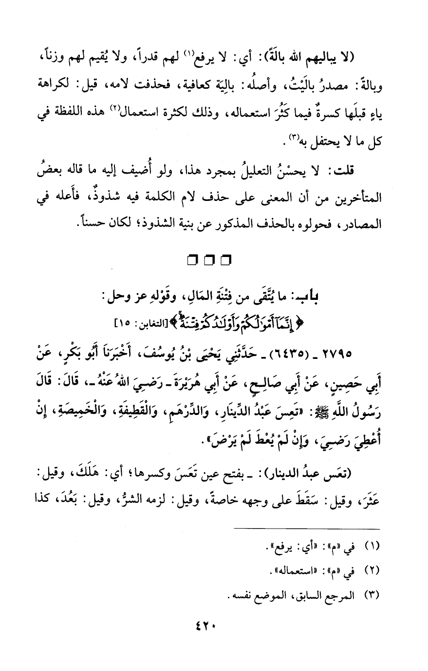 باب: ما يُتَّقَى من فِتْنَةِ المَالِ، وقَوْلهِ عز وجل: {إِنَّمَا أَمْوَالُكُمْ وَأَوْلَادُكُمْ فِتْنَةٌ} [التغابن: 15]