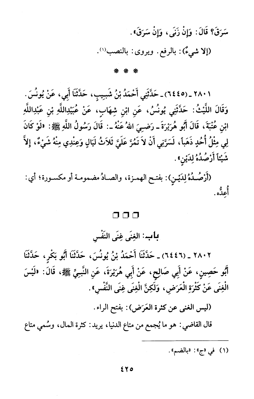 2802 - (6446) - حَدَّثَنَا أَحمَدُ بْنُ يُونُسَ، حَدَّثَنَا أبَو بَكْرٍ، حَدَّثَنَا أَبُو حَصِينٍ، عَنْ أَبِي صَالِحٍ، عَنْ أَبِي هُرَيْرَةَ، عَنِ النَّبِيِّ - صلى الله عليه وسلم -، قَالَ: "لَيْسَ الْغِنَى عَنْ كَثْرَةِ الْعَرَضِ، وَلَكِنَّ الْغِنَى غِنَى النَّفْسِ".