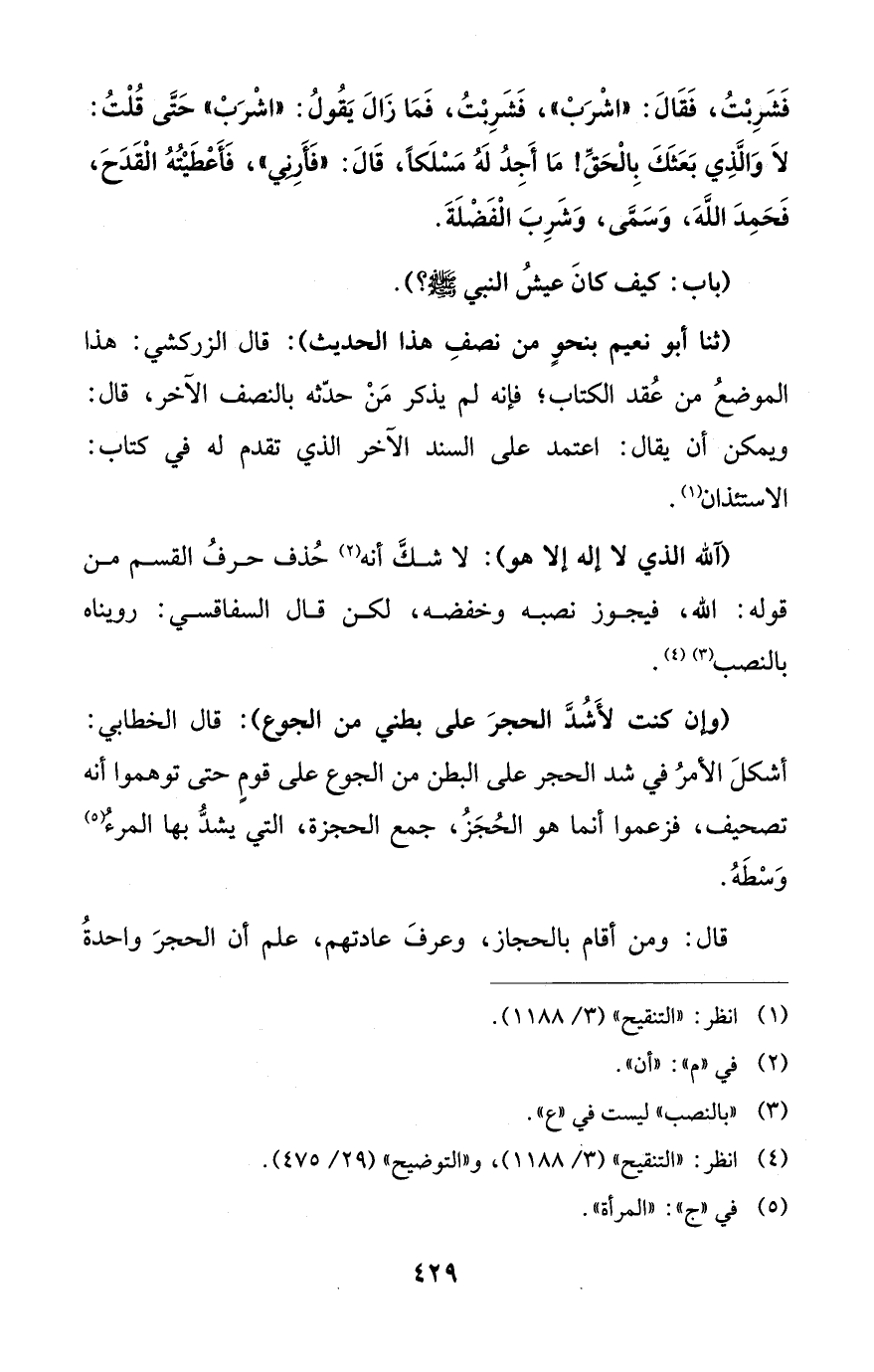 (وإن كنت لأَشُدَّ الحجرَ على بطني من الجوع): قال الخطابي: أشكلَ الأمرُ في شد الحجر على البطن من الجوع على قومٍ حتى توهموا أنه تصحيف، فزعموا أنما هو الحُجَزُ، جمع الحجزة، التي يشدُّ بها المرءُ (¬5) وَسْطَهُ.
