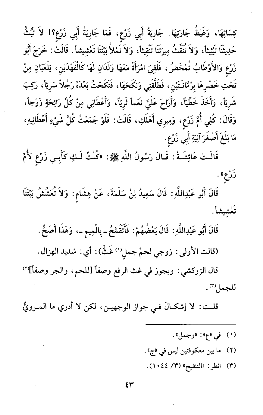 كسَائِهَا، وَغَيْظُ جَارَتِهَا. جَارِيَةُ أَبِي زَرْعٍ، فَمَا جَارِيَةُ أَبِي زَرْعٍ؟! لَا تَبُثُّ حَدِيثَنَا تَبْثِيثًا، وَلَا تُنَقِّثُ مِيرَتَنَا تَنْقِيثًا، وَلَا تَمْلأُ بَيْتَنَا تَعْشِيشًا. قَالَتْ: خَرَجَ أَبُو زَرْعٍ وَالأَوْطَابُ تُمْخَضُ، فَلَقِيَ امْرَأَةً مَعَهَا وَلَدَانِ لَهَا كَالْفَهْدَيْنِ، يَلْعَبَانِ مِنْ تَحْتِ خَصْرِهَا بِرُمَّانَتَيْنِ، فَطَلَّقَنِي وَنَكَحَهَا، فَنَكَحْتُ بَعْدَهُ رَجُلًا سَرَيًّا، رَكَبَ شَرِيًّا، وَأَخَذَ خَطِّيًّا، وَأَرَاحَ عَلَيَّ نَعَمًا ثَرِيًّا، وَأَعْطَانِي مِنْ كُلِّ رَائِحَةٍ زَوْجًا، وَقَالَ: كُلِي أُمَّ زَرْعٍ، وَمِيرِي أَهْلَكِ، قَالَتْ: فَلَوْ جَمَعْتُ كُلَّ شَيْءٍ أَعْطَانِيهِ، مَا بَلَغَ أَصْغَرَ آنِيَةِ أَبي زَرْعٍ.
