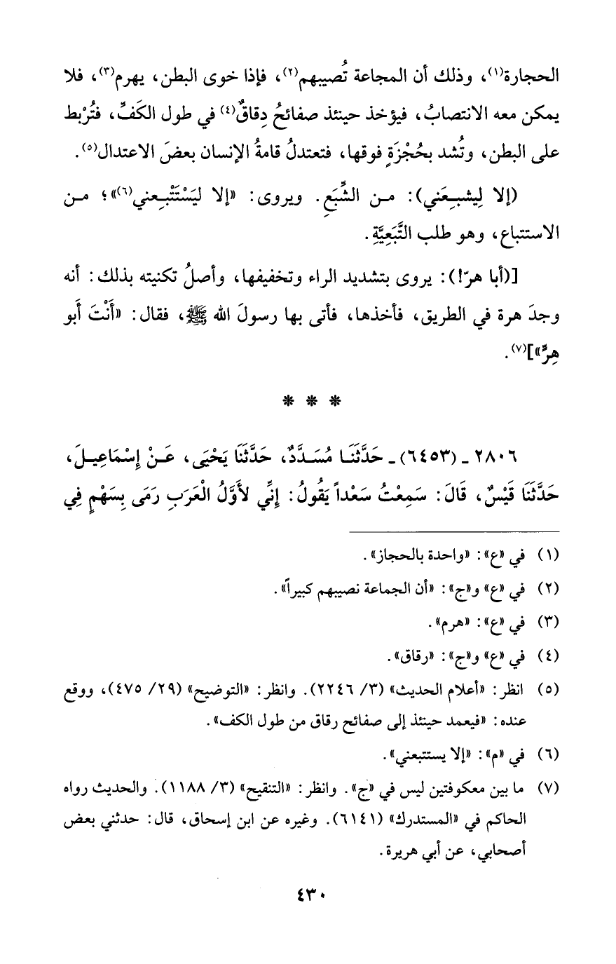 2806 - (6453) - حَدَّثَنَا مُسَدَّدٌ، حَدَّثَنَا يَحْيَى، عَنْ إِسْمَاعِيلَ، حَدَّثَنَا قَيْسٌ، قَالَ: سَمِعْتُ سَعداً يَقُولُ: إِنِّي لأَوَّلُ الْعَرَبِ رَمَى بِسَهْمٍ فِي