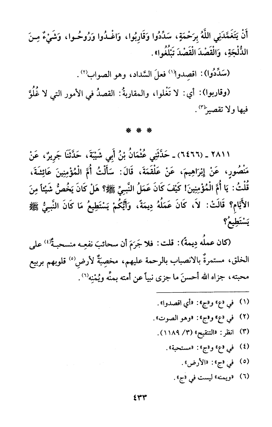 2811 - (6466) - حَدَّثَنِي عُثْمَانُ بْنُ أَبِي شَيْبَةَ، حَدَّثَنَا جَرِيرٌ، عَنْ مَنْصُورٍ، عَنْ إِبْرَاهِيمَ، عَنْ عَلْقَمَةَ، قَالَ: سَأَلْتُ أُمَّ الْمُؤْمِنِينَ عَائِشَةَ، قُلْتُ: يَا أُمَّ الْمُؤْمِنِينَ! كَيْفَ كَانَ عَمَلُ النَّبِيِّ - صلى الله عليه وسلم -؟ هَلْ كَانَ يَخُصُّ شَيْئاً مِنَ الأَيَّامِ؟ قَالَتْ: لاَ، كانَ عَمَلُهُ دِيمَةً، وَأَيُّكُمْ يَسْتَطِيعُ مَا كانَ النَّبِيُّ - صلى الله عليه وسلم - يَسْتَطِيعُ؟