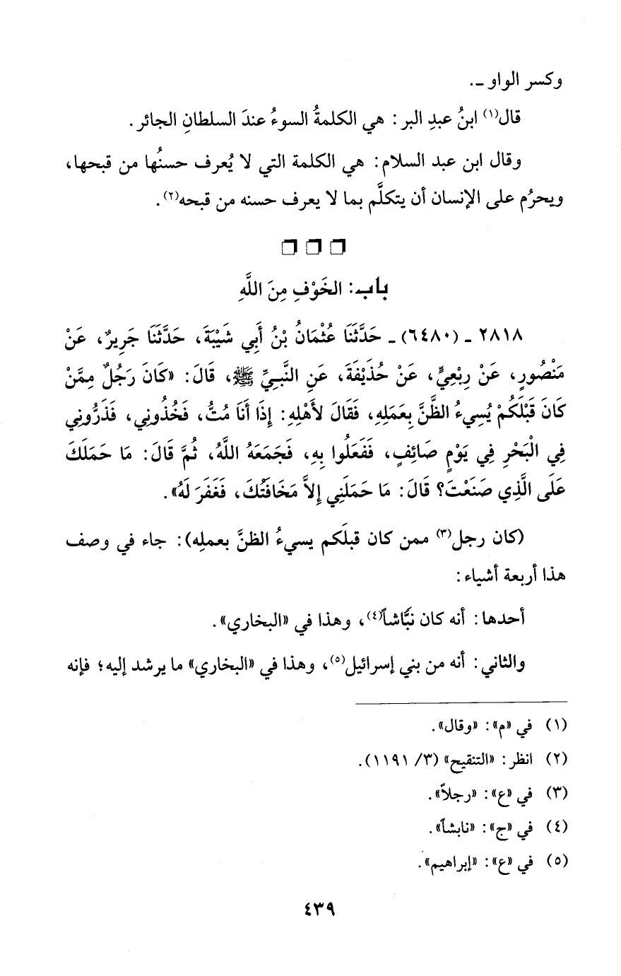 2818 - (6480) - حَدَّثَنَا عُثْمَانُ بْنُ أَبِي شَيْبَةَ، حَدَّثَنَا جَرِيرٌ، عَنْ مَنْصُورٍ، عَنْ رِبْعِيٍّ، عَنْ حُذَيْفَةَ، عَنِ النَّبِيِّ - صلى الله عليه وسلم -، قَالَ: "كانَ رَجُلٌ مِمَّنْ كَانَ قَبْلَكُمْ يُسِيءُ الظَّنَّ بِعَمَلِهِ، فَقَالَ لأَهْلِهِ: إِذَا أَنَا مُتُّ، فَخُذُونِي، فَذَرُّونِي فِي الْبَحْرِ فِي يَوْمٍ صَائِفٍ، فَفَعَلُوا بِهِ، فَجَمَعَهُ اللهُ، ثُمَّ قَالَ: مَا حَمَلَكَ عَلَى الَّذِي صَنَعْتَ؟ قَالَ: مَا حَمَلَنِي إِلَّا مَخَافَتُكَ، فَغَفَرَ لَهُ".