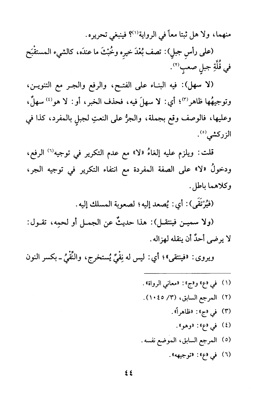 (لا سهل): فيه البناء على الفتح، والرفع والجر مع التنوين، وتوجيهُها ظاهر (¬3)؛ أي: لا سهلَ فيه، فحذف الخبر، أو: لا هو (¬4) سهلٌ، وعليها، فالوصف وقع بجملة، والجرُّ على النعتِ لجبلٍ بالمفرد، كذا في الزركشي (¬5).