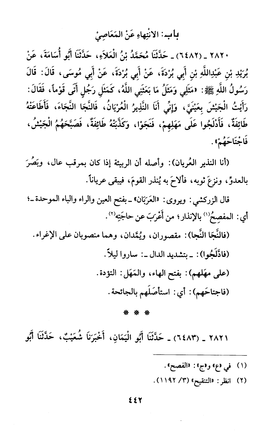 2820 - (6482) - حَدَّثَنَا مُحَمَّدُ بْنُ الْعَلَاءِ، حَدَّثَنَا أَبُو أُسَامَةَ، عَنْ بُرَيْدِ بْنِ عَبْدِ اللهِ بْنِ أَبِي بُرْدَةَ، عَنْ أَبي بُرْدَةَ، عَنْ أَبِي مُوسَى، قَالَ: قَالَ رَسُولُ اللهِ - صلى الله عليه وسلم -: "مَثَلِي وَمَثَلُ مَا بَعَثَنِي اللهُ، كَمَثَلِ رَجُلٍ أَتَى قَوْمًا، فَقَالَ: رَأَيْتُ الْجَيْشَ بِعَيْنَيَّ، وَإِنِّي أَنَا النَّذِيرُ الْعُرْيَانُ، فَالنَّجَا النَّجَاءَ، فَأَطَاعَتْهُ طَائِفَةٌ، فَأَدْلَجُوا عَلَى مَهَلِهِمْ، فَنَجَوْا، وَكَذَّبَتْهُ طَائِفَةٌ، فَصَبَّحَهُمُ الْجَيْشُ، فَاجْتَاحَهُمْ".