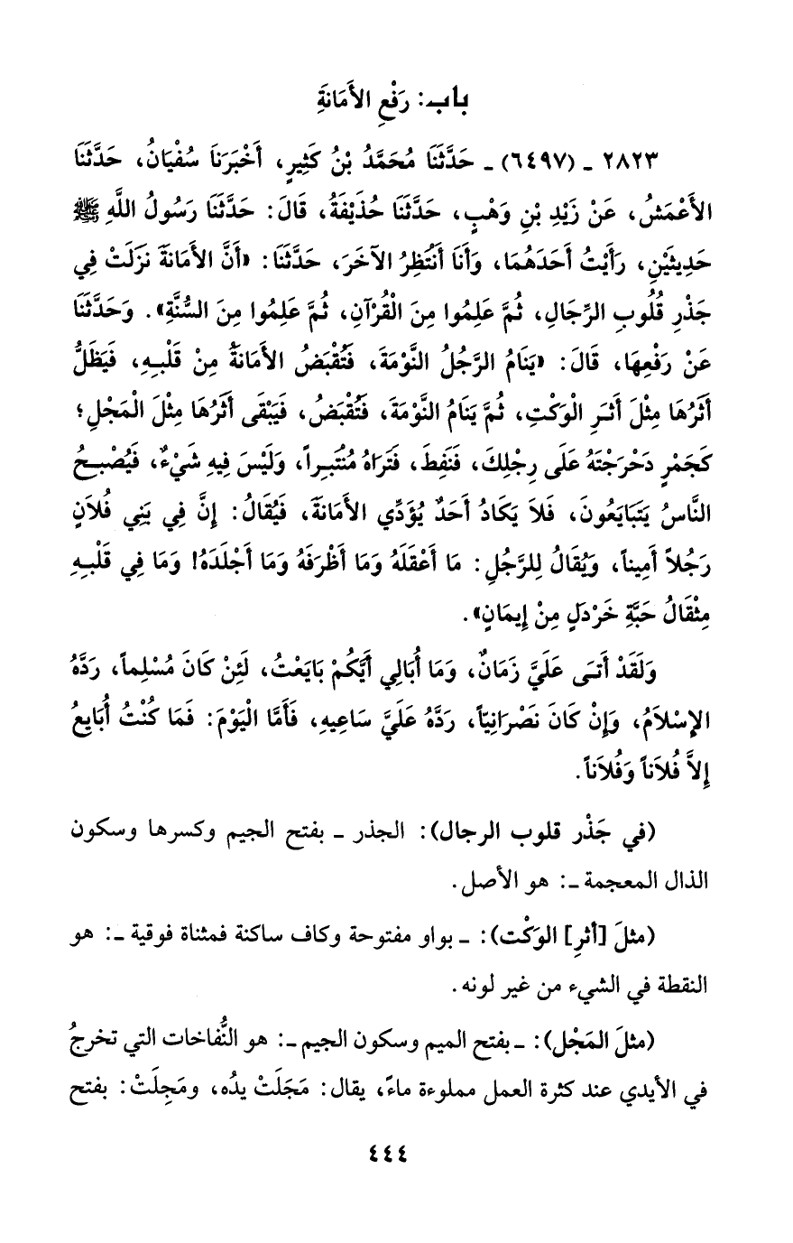 2823 - (6497) - حَدَّثَنَا مُحَمَّدُ بْنُ كَثِيرٍ، أَخْبَرَنَا سُفْيَانُ، حَدَّثَنَا الأَعْمَشُ، عَنْ زَيْدِ بْنِ وَهْبٍ، حَدَّثَنَا حُذَيْفَةُ، قَالَ: حَدَّثَنَا رَسُولُ اللهِ - صلى الله عليه وسلم - حَدِيثَيْنِ، رَأَيْتُ أَحَدَهُمَا، وَأَنَا أَنْتَظِرُ الآخَرَ، حَدَّثَنَا: "أَنَّ الأَمَانَةَ نَزَلَتْ فِي جَذْرِ قُلُوبِ الرِّجَالِ، ثُمَّ عَلِمُوا مِنَ الْقُرْآنِ، ثُمَّ عَلِمُوا مِنَ السُّنَّةِ". وَحَدَّثَنَا عَنْ رَفْعِهَا، قَالَ: "يَنَامُ الرَّجُلُ النَّوْمَةَ، فَتُقْبَضُ الأَمَانَةُ مِنْ قَلْبِهِ، فَيَظَلُّ أَثَرُهَا مِثْلَ أَثَرِ الْوَكْتِ، ثُمَّ يَنَامُ النَّوْمَةَ، فَتُقْبَضُ، فَيَبْقَى أَثَرُهَا مِثْلَ الْمَجْلِ؛ كَجَمْرٍ دَحْرَجْتَهُ عَلَى رِجْلِكَ، فَنَفِطَ، فَتَرَاهُ مُنْتَبِرًا، وَلَيْسَ فِيهِ شَيْءٌ، فَيُصْبحُ النَّاسُ يَتَبَايَعُونَ، فَلَا يَكَادُ أَحَدٌ يُؤَدِّي الأَمَانَةَ، فَيُقَالُ: إِنَّ فِي بَنِي فُلَانٍ رَجُلًا أَمِيناً، وَيُقَالُ لِلرَّجُلِ: مَا أَعْقَلَهُ وَمَا أَظْرَفَهُ وَمَا أَجْلَدَهُ! وَمَا فِي قَلْبِهِ مِثْقَالُ حَبَّةِ خَرْدَلٍ مِنْ إِيمَانٍ".