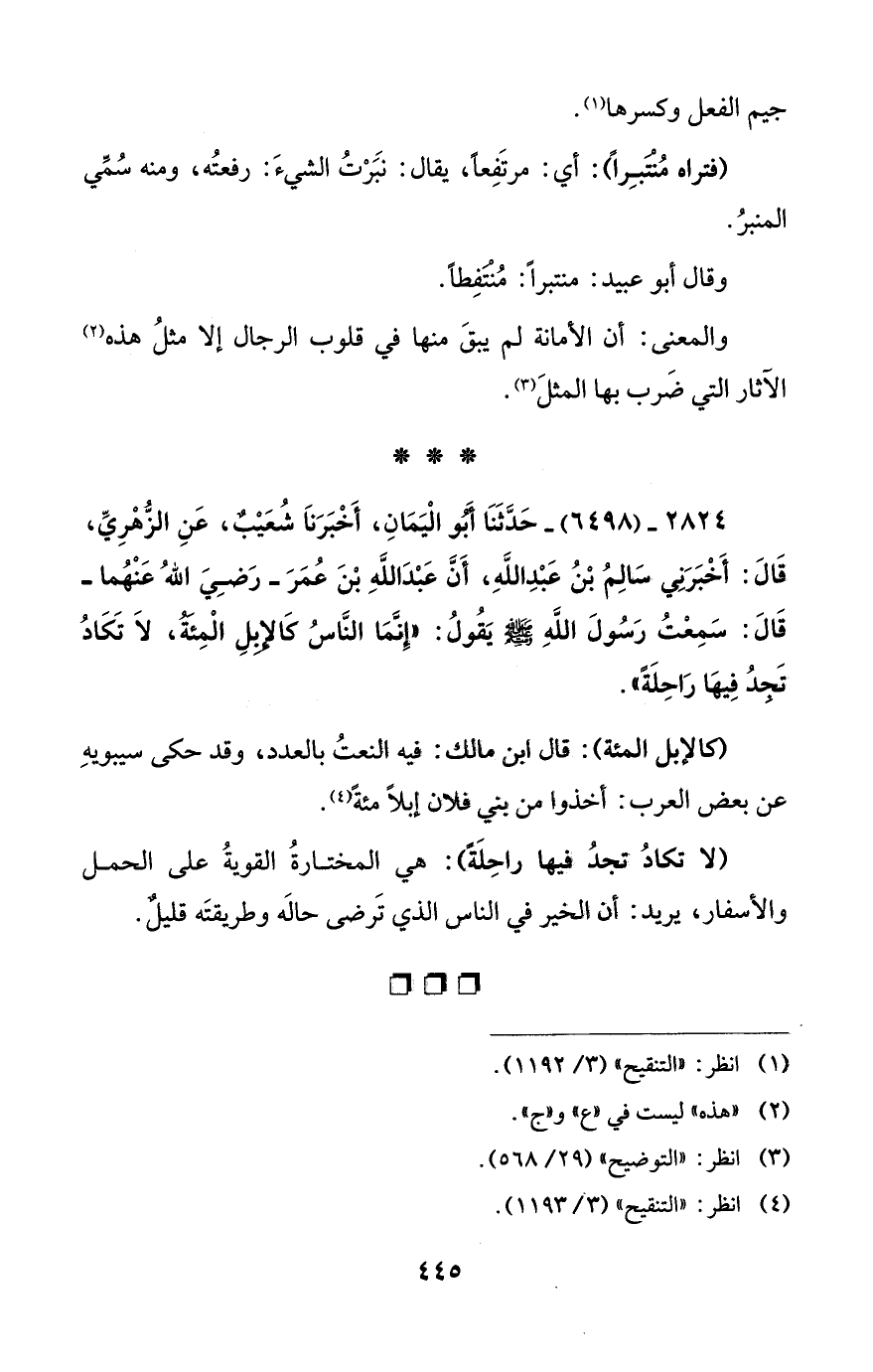 2824 - (6498) - حَدَّثَنَا أَبُو الْيَمَانِ، أَخْبَرَنَا شُعَيْبٌ، عَنِ الزُّهْرِيِّ، قَالَ: أَخْبَرَنِي سَالِمُ بْنُ عَبْدِ اللهِ، أَنَّ عَبْدَ اللهِ بْنَ عُمَرَ - رَضِيَ اللهُ عَنْهُما - قَالَ: سَمِعْتُ رَسُولَ اللهِ - صلى الله عليه وسلم - يَقُولُ: "إِنَّمَا النَّاسُ كَالإِبلِ الْمِئَةُ، لَا تَكَادُ تَجِدُ فِيهَا رَاحِلَةً".