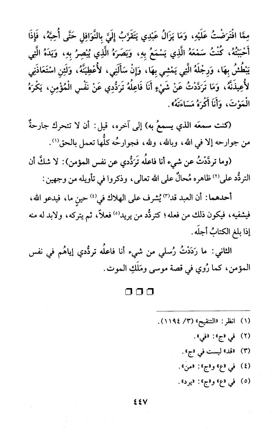 (وما تردَّدْتُ عن شيء أنا فاعلُه تَرَدُّدي عن نفس المؤمن): لا شكَّ أن التردُّد على (¬2) ظاهره مُحالٌ على الله تعالى، وذكروا في تأويله من وجهين: