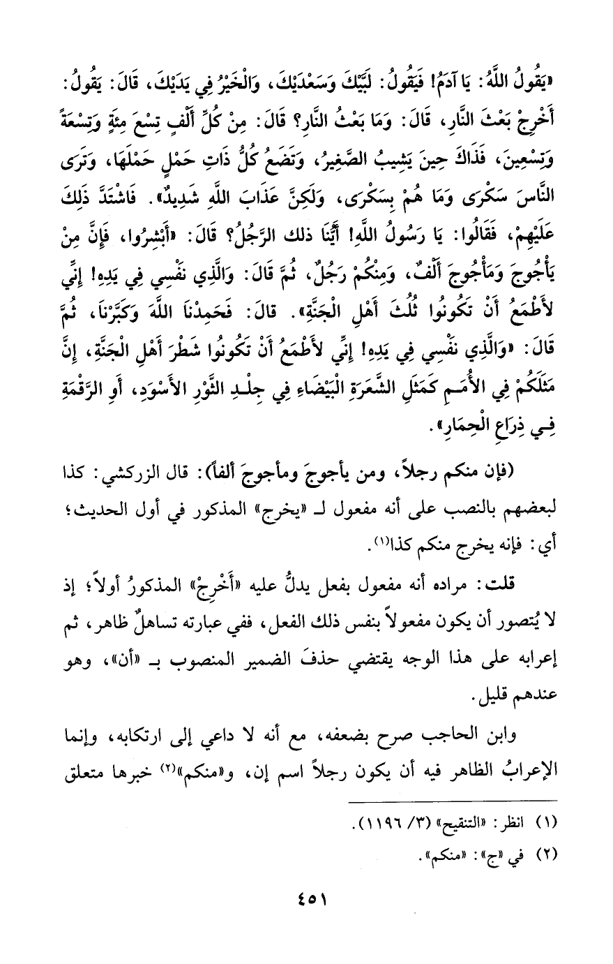 (فإن منكم رجلًا، ومن يأجوجَ ومأجوجَ ألفاً): قال الزركشي: كذا لبعضهم بالنصب على أنه مفعول لـ "يخرج" المذكور في أول الحديث؛ أي: فإنه يخرج منكم كذا (¬1).