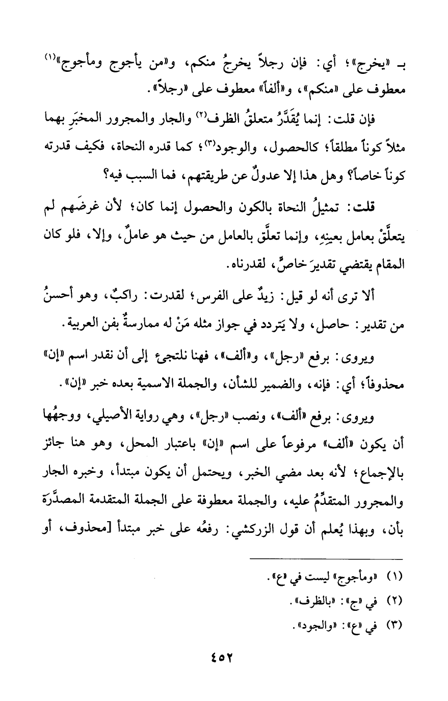 ويروى: برفع "ألف"، ونصب "رجل"، وهي رواية الأصيلي، ووجهُها أن يكون "ألف" مرفوعاً على اسم "إن" باعتبار المحل، وهو هنا جائز بالإجماع؛ لأنه بعد مضي الخبر، ويحتمل أن يكون مبتدأ، وخبره الجار والمجرور المتقدِّمُ عليه، والجملة معطوفة على الجملة المتقدمة المصدَّرَة بأن، وبهذا يُعلم أن قول الزركشي: رفعُه على خبر مبتدأ [محذوف، أو