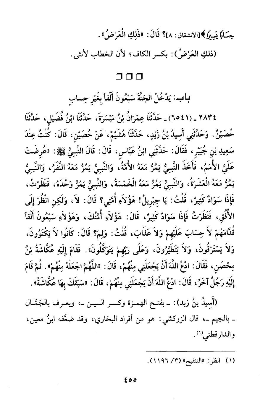 2834 - (6541) - حَدَّثَنَا عِمْرَانُ بْنُ مَيْسَرَةَ، حَدَّثَنَا ابْنُ فُضَيْلٍ، حَدَّثَنَا حُصَيْنٌ. وَحَدَّثَنِي أَسِيدُ بْنُ زَيْدٍ، حَدَّثَنَا هُشَيْمٌ، عَنْ حُصَيْنٍ، قَالَ: كُنْتُ عِنْدَ سَعِيدِ بْنِ جُبَيْرٍ، فَقَالَ: حَدَّثَنِي ابْنُ عَبَّاسٍ، قَالَ: قَالَ النَّبِيُّ - صلى الله عليه وسلم -: "عُرِضَتْ عَلَيَّ الأُمَمُ، فَأَخَذَ النَّبِيُّ يَمُرُّ مَعَهُ الأُمَّةُ، وَالنَّبِيُّ يَمُرُّ مَعَهُ النَّفَرُ، وَالنَّبِيُّ يَمُرُّ مَعَهُ الْعَشَرَةُ، وَالنَّبِيُّ يَمُرُّ مَعَهُ الْخَمْسَةُ، وَالنَّبِيُّ يَمُرُّ وَحْدَهُ، فَنَظَرْتُ، فَإِذَا سَوَادٌ كَثِيرٌ، قُلْتُ: يَا جِبْرِيلُ! هَؤُلَاءِ أُمَّتِي؟ قَالَ: لَا، وَلَكِنِ انْظُرْ إِلَى الأُفُقِ، فَنَظَرْتُ فَإِذَا سَوَادٌ كَثِيرٌ، قَالَ: هَؤُلَاءِ أُمَّتُكَ، وَهَؤُلَاءِ سَبْعُونَ أَلْفاً قُدَّامَهُمْ لَا حِسَابَ عَلَيْهِمْ وَلَا عَذَابَ، قُلْتُ: وَلِمَ؟ قَالَ: كَانوُا لَا يَكْتَوُونَ، وَلَا يَسْتَرْقُونَ، وَلَا يَتَطَيَّرُونَ، وَعَلَى رَبِّهِمْ يَتَوَكَّلُونَ". فَقَامَ إِلَيْهِ عُكَّاشَةُ بْنُ مِحْصَنٍ، فَقَالَ: ادْعُ اللهَ أَنْ يَجْعَلَنِي مِنْهُمْ، قَالَ: "اللَّهُمَّ اجْعَلْهُ مِنْهُمْ". ثُمَّ قَامَ إِلَيْهِ رَجُلٌ آخَرُ، قَالَ: ادْعُ اللهَ أَنْ يَجْعَلَنِي مِنْهُمْ، قَالَ: "سَبَقَكَ بِهَا عُكَاشَةُ".