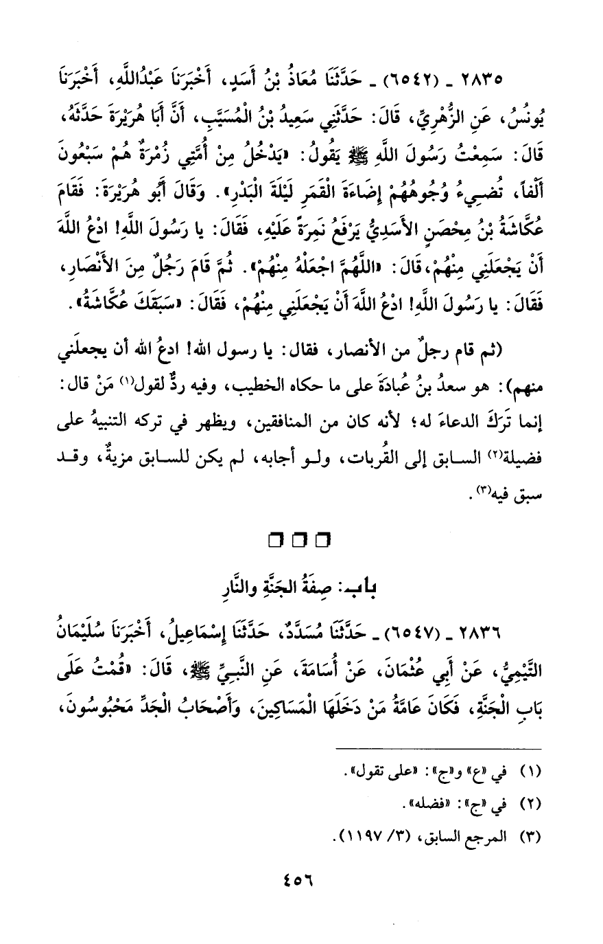 2835 - (6542) - حَدَّثَنَا مُعَاذُ بْنُ أَسَدٍ، أَخْبَرَنَا عَبْدُ اللهِ، أَخْبَرَنَا يُونُسُ، عَنِ الزُّهْرِيِّ، قَالَ: حَدَّثَنِي سَعِيدُ بْنُ الْمُسَيَّبِ، أَنَّ أَبَا هُرَيْرَةَ حَدَّثَهُ، قَالَ: سَمِعْتُ رَسُولَ اللهِ - صلى الله عليه وسلم - يَقُولُ: "يَدْخُلُ مِنْ أُمَّتِي زُمْرَةٌ هُمْ سَبْعُونَ أَلْفاً، تُضِيءُ وُجُوهُهُمْ إِضَاءَةَ الْقَمَرِ لَيْلَةَ الْبَدْرِ". وَقَالَ أَبُو هُرَيْرَةَ: فَقَامَ عُكَّاشَةُ بْنُ مِحْصَنٍ الأَسَدِيُّ يَرْفَعُ نَمِرَةً عَلَيْهِ، فَقَالَ: يا رَسُولَ اللهِ! ادْعُ اللهَ أَنْ يَجْعَلَنِي مِنْهُمْ، قَالَ: "اللَّهُمَّ اجْعَلْهُ مِنْهُمْ". ثُمَّ قَامَ رَجُلٌ مِنَ الأَنْصَارِ، فَقَالَ: يا رَسُولَ اللهِ! ادْعُ اللهَ أَنْ يَجْعَلَنِي مِنْهُمْ، فَقَالَ: "سَبَقَكَ عُكَّاشَةُ".
