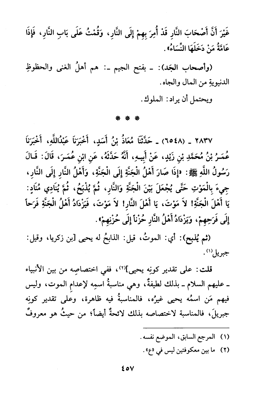 2837 - (6548) - حَدَّثَنَا مُعَاذُ بْنُ أَسَدٍ، أَخْبَرَنَا عَبْدُ اللهِ، أَخْبَرَنَا عُمَرُ بْنُ مُحَمَّدِ بْنِ زَيْدٍ، عَنْ أَبِيهِ، أَنَّهُ حَدَّثَهُ، عَنِ ابْنِ عُمَرَ، قَالَ: قَالَ رَسُولُ اللهِ - صلى الله عليه وسلم -: "إِذَا صَارَ أَهْلُ الْجَنَّةِ إِلَى الْجَنَّةِ، وَأَهْلُ النَّارِ إِلَى النَّارِ، جِيءَ بِالْمَوْتِ حَتَّى يُجْعَلَ بَيْنَ الْجَنَّةِ وَالنَّارِ، ثُمَّ يُذْبَحُ، ثُمَّ يُنَادِي مُنَادٍ: يَا أَهْلَ الْجَنَّةِ! لَا مَوْتَ، يَا أَهْلَ النَّارِ! لَا مَوْتَ، فَيَزْدَادُ أَهْلُ الْجَنَّةِ فَرَحاً إِلَى فَرَحِهِمْ، وَيَزْدَادُ أَهْلُ النَّارِ حُزْناً إِلَى حُزْنِهِمْ".