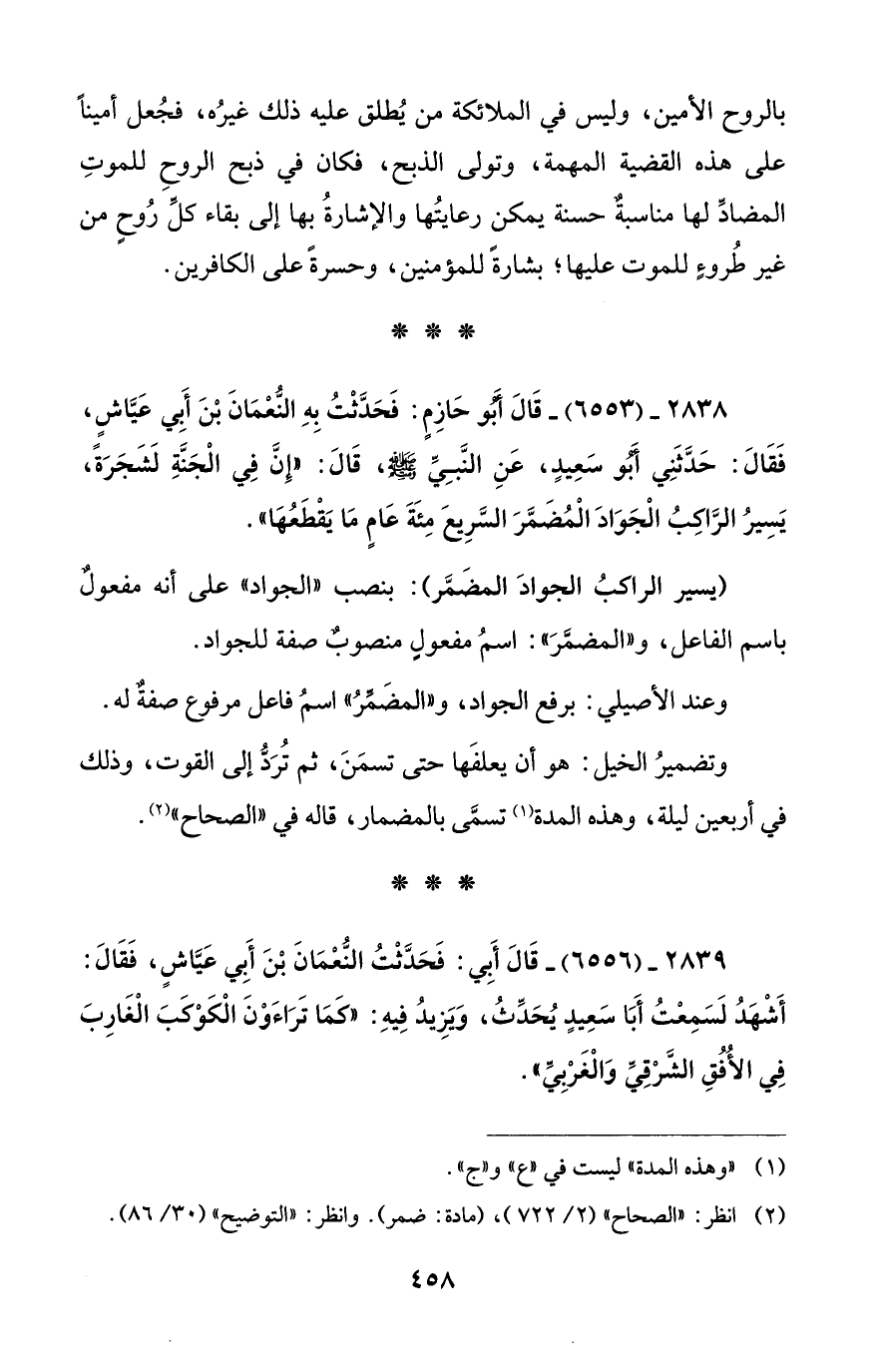 2838 - (6553) - قَالَ أَبُو حَازِمٍ: فَحَدَّثْتُ بِهِ النُّعْمَانَ بْنَ أَبِي عَيَّاشٍ، فَقَالَ: حَدَّثَنِي أَبُو سَعِيدٍ، عَنِ النَّبِيِّ - صلى الله عليه وسلم -، قَالَ: "إِنَّ فِي الْجَنَّةِ لَشَجَرَةً، يَسِيرُ الرَّاكِبُ الْجَوَادَ الْمُضَمَّرَ السَّرِيعَ مِئَةَ عَامٍ مَا يَقْطَعُهَا".