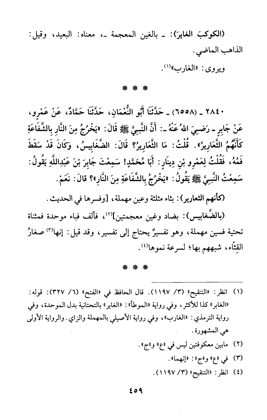 2840 - (6558) - حَدَّثَنَا أَبُو النُّعْمَانِ، حَدَّثَنَا حَمَّادٌ، عَنْ عَمْرٍو، عَنْ جَابِرٍ - رَضِيَ اللهُ عَنْهُ -: أَنَّ النَّبِيَّ - صلى الله عليه وسلم - قَالَ: "يَخْرُجُ مِنَ النَّارِ بِالشَّفَاعَةِ كَأَنَّهُمُ الثَّعَارِيرُ". قُلْتُ: مَا الثَّعَارِيرُ؟ قَالَ: الضَّغَابِيسُ، وَكَانَ قَدْ سَقَطَ فَمُهُ، فَقُلْتُ لِعَمْرِو بْنِ دِينَارٍ: أَبَا مُحَمَّدٍ! سَمِعْتَ جَابِرَ بْنَ عَبْدِ اللهِ يَقُولُ: سَمِعْتُ النَّبِيَّ - صلى الله عليه وسلم - يَقُولُ: "يَخْرُجُ بِالشَّفَاعَةِ مِنَ النَّارِ"؟ قالَ: نَعَمْ.