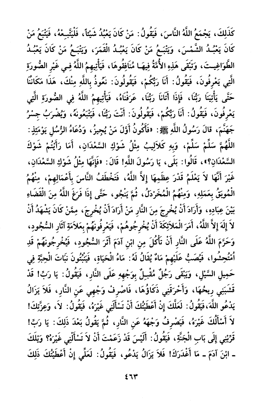 كَذَلِكَ، يَجْمَعُ اللهُ النَّاسَ، فَيَقُولُ: مَنْ كَانَ يَعْبُدُ شَيْئاً، فَلْيَتَّبِعْهُ، فَيَتْبَعُ مَنْ كَانَ يَعْبُدُ الشَّمْسَ، وَيَتْبَعُ مَنْ كَانَ يَعْبُدُ الْقَمَرَ، وَيَتْبَعُ مَنْ كَانَ يَعْبُدُ الطَّوَاغِيتَ، وَتَبْقَى هَذِهِ الأُمَّةُ فِيهَا مُنَافِقُوهَا، فَيَأْتِيهِمُ اللهُ فِي غَيْرِ الصُّورَةِ الَّتِي يَعْرِفُونَ، فَيَقُولُ: أَنَا رَبُّكُّمْ، فَيَقُولُونَ: نَعُوذُ بِاللهِ مِنْكَ، هَذَا مَكَانُنَا حَتَّى يَأْتِيَنَا رَبُّنَا، فَإِذَا أَتَانَا رَبُّنَا، عَرَفْنَاهُ، فَيَأْتِيهِمُ اللهُ فِي الصُّورَةِ الَّتِي يَعْرِفُونَ، فَيقُولُ: أَنَا رَبُّكُّمْ، فَيَقُولُونَ: أَنْتَ رَبُّنَا، فَيَتِبَعُونَهُ، وَيُضْرَبُ جِسْرُ جَهَنَّمَ، قالَ رَسُولُ اللهِ - صلى الله عليه وسلم -: "فَأَكُونُ أَوَّلَ مَنْ يُجِيزُ، وَدُعَاءُ الرُّسُلِ يَوْمَئِذٍ: اللَّهُمَّ سَلِّمْ سَلِّمْ، وَبِهِ كَلَالِيبُ مِثْلُ شَوْكِ السَّعْدَانِ، أَمَا رَأَيْتُمْ شَوْكَ السَّعْدَانِ؟ "، قَالُوا: بَلَى، يَا رَسُولَ اللهِ! قَالَ: "فَإِنَّهَا مِثْلُ شَوْكِ السَّعْدَانِ، غَيْرَ أَنَّهَا لَا يَعْلَمُ قَدْرَ عِظَمِهَا إِلَّا اللهُ، فَتَخْطَفُ النَّاسَ بِأَعْمَالِهِمْ، مِنْهُمُ الْمُوبَقُ بِعَمَلِهِ، وَمِنْهُمُ الْمُخَرْدَلُ، ثُمَّ يَنْجُو، حَتَّى إِذَا فَرَغَ اللهُ مِنَ الْقَضَاءِ بَيْنَ عِبَادِهِ، وَأَرَادَ أَنْ يُخْرِجَ مِنَ النَّارِ مَنْ أَرَادَ أَنْ يُخْرِجَ، مِمَّنْ كَانَ يَشْهَدُ أَنْ لَا إِلَهَ إِلَّا اللهُ، أَمَرَ الْمَلَائِكَةَ أَنْ يُخْرِجُوهُمْ، فَيَعْرِفُونَهُمْ بِعَلَامَةِ آثَارِ السُّجُودِ، وَحَرَّمَ اللهُ عَلَى النَّارِ أَنْ تَأْكُلَ مِنِ ابْنِ آدَمَ أَثَرَ السُّجُودِ، فَيُخْرِجُونَهُمْ قَدِ اُمْتُحِشُوا، فَيُصَبُّ عَلَيْهِمْ مَاءٌ يُقَالُ لَهُ: مَاءُ الْحَيَاةِ، فَيَنْبُتُونَ نَبَاتَ الْحِبَّةِ فِي حَمِيلِ السَّيْلِ، وَيَبْقَى رَجُلٌ مُقْبِلٌ بِوَجْهِهِ عَلَى النَّارِ، فَيَقُولُ: يَا رَبِّ! قَدْ قَشَبَنِي رِيحُهَا، وَأَحْرَقَنِي ذَكَاؤُهَا، فَاصْرِفْ وَجْهِي عَنِ النَّارِ، فَلَا يَزَالُ يَدْعُو اللهَ، فَيَقُولُ: لَعَلَّكَ إِنْ أَعْطَيْتُكَ أَنْ تَسْأَلَنِي غَيْرَهُ، فَيَقُولُ: لَا، وَعِزَّتِكَ! لَا أَسْأَلُكَ غَيْرَهُ، فَيَصْرِفُ وَجْهَهُ عَنِ النَّارِ، ثُمَّ يَقُولُ بَعْدَ ذَلِكَ: يَا رَبِّ! قَرِّبَنِي إِلَى بَابِ الْجَنَّةِ، فَيَقُولُ: أَلَيْسَ قَدْ زَعَمْتَ أَنْ لَا تَسْأَلْنِي غَيْرَهُ؟ وَيْلَكَ - ابْنَ آدَمَ - مَا أَغْدَرَكَ! فَلَا يَزَالُ يَدْعُو، فَيَقُولُ: لَعَلِّي إِنْ أَعْطَيْتُكَ ذَلِكَ