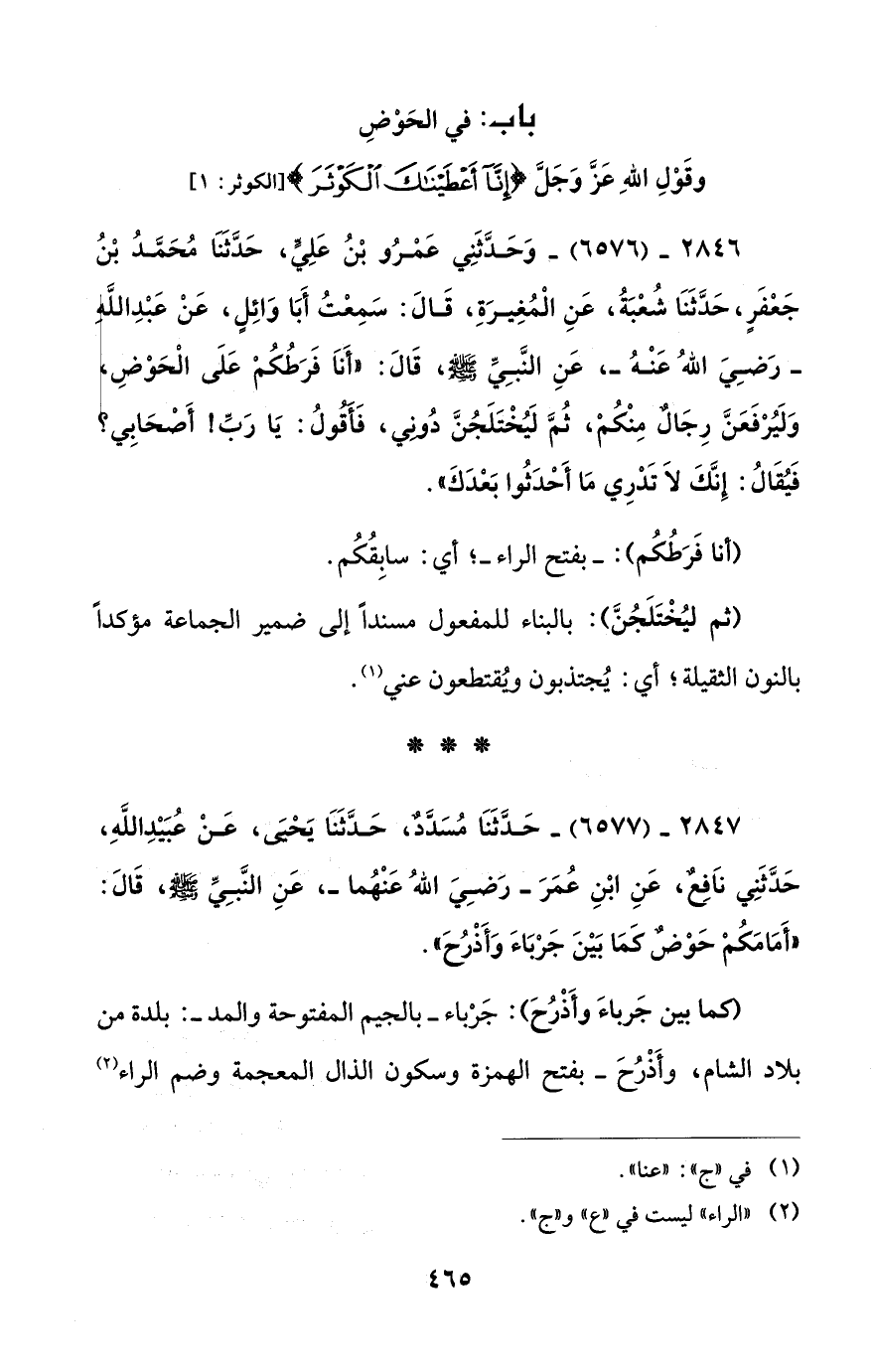 2847 - (6577) - حَدَّثَنَا مُسَدَّد، حَدَّثَنَا يَحْيَى، عَنْ عُبَيْدِ اللَّهِ، حَدَّثَنِي ناَفِعٌ، عَنِ ابْنِ عُمَرَ - رَضِيَ اللهُ عَنْهُما -، عَنِ النَّبِيِّ - صلى الله عليه وسلم -، قَالَ: "أَمَامَكُمْ حَوْضٌ كَمَا بَيْنَ جَرْبَاءَ وَأَذْرُحَ".