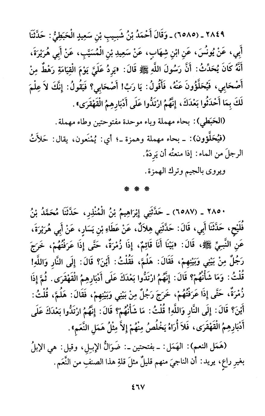 2850 - (6587) - حَدَّثَنِي إِبْرَاهِيمُ بْنُ الْمُنْذِرِ، حَدَّثَنَا مُحَمَّدُ بْنُ فُلَيْحٍ، حَدَّثَنَا أَبي، قَالَ: حَدَّثَنِي هِلَالٌ، عَنْ عَطَاءَ بْنِ يَسَارٍ، عَنْ أَبي هُرَيْرَةَ، عَنِ النَّبِيِّ - صلى الله عليه وسلم -، قَالَ: "بَيْنَا أَنَا قَائِمٌ، إِذَا زُمْرَةٌ، حَتَّى إِذَا عَرَفْتُهُمْ، خَرَجَ رَجُلٌ مِنْ بَيْنِي وَبَيْنِهِمْ، فَقَالَ: هَلُمَّ، فَقُلْتُ: أَيْنَ؟ قَالَ: إِلَى النَّارِ وَاللهِ! قُلْتُ: وَمَا شَأْنُهُمْ؟ قَالَ: إِنَّهُمُ ارْتَدُّوا بَعْدَكَ عَلَى أَدْبَارِهِمُ الْقَهْقَرَى. ثُمَّ إِذَا زُمْرَةٌ، حَتَّى إِذَا عَرَفْتُهُمْ، خَرَجَ رَجُلٌ مِنْ بَيْنِي وَبَيْنِهِمْ، فَقَالَ: هَلُمَّ، قُلْتُ: أَيْنَ؟ قَالَ: إِلَى النَّارِ وَاللهِ! قُلْتُ: مَا شَأْنُهُمْ؟ قَالَ: إِنَّهُمُ ارْتَدُّوا بَعْدَكَ عَلَى أَدْبَارِهِمُ الْقَهْقَرَى، فَلَا أُرَاهُ يَخْلُصُ مِنْهُمْ إِلَّا مِثْلُ هَمَلِ النَّعَمِ".