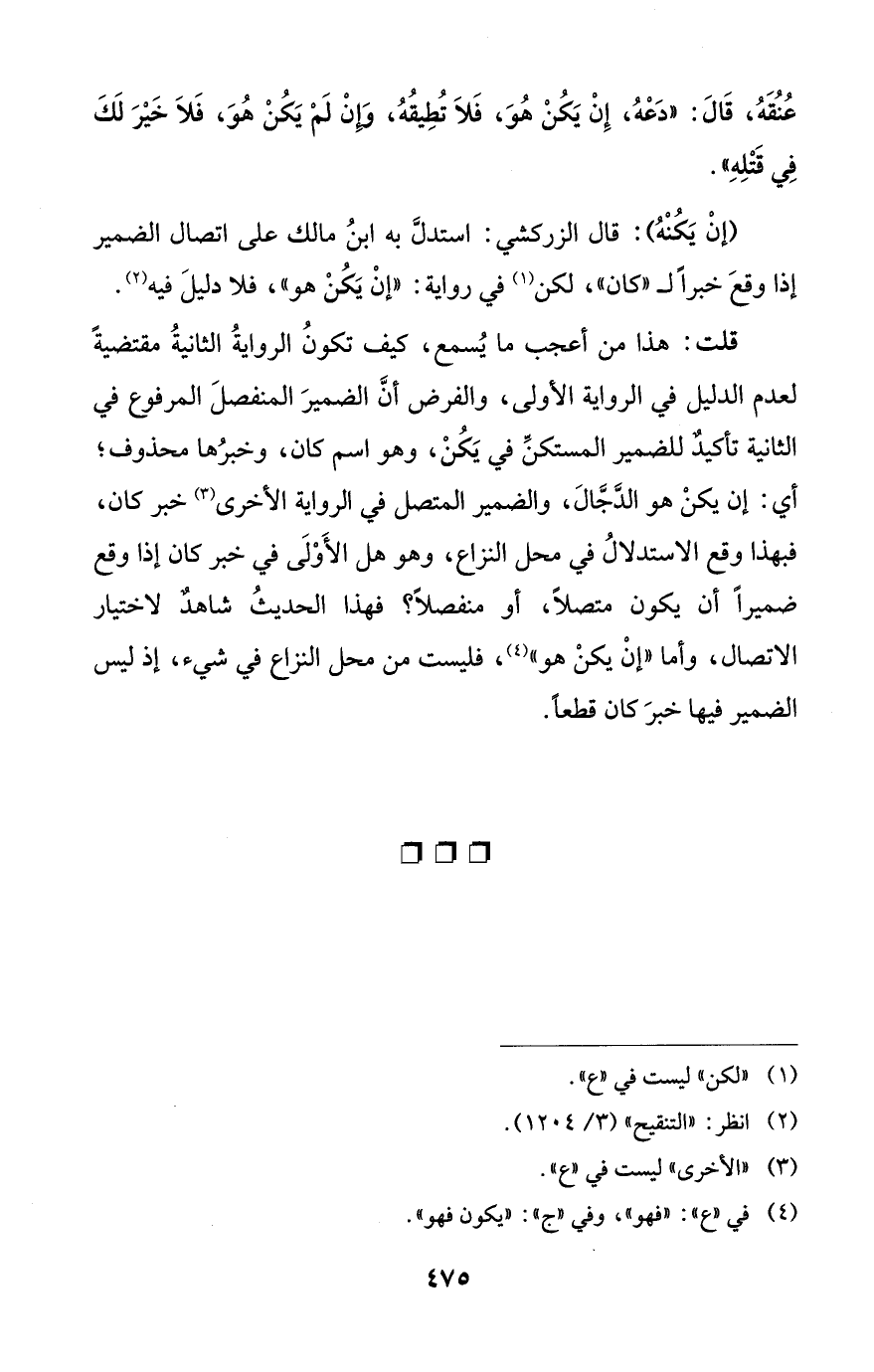 قلت: هذا من أعجب ما يُسمع، كيف تكونُ الروايةُ الثانيةُ مقتضيةً لعدم الدليل في الرواية الأولى، والفرض أنَّ الضميرَ المنفصلَ المرفوع في الثانية تأكيدٌ للضمير المستكنِّ في يَكُنْ، وهو اسم كان، وخبرُها محذوف؛ أي: إن يكنْ هو الدَّجَّالَ، والضمير المتصل في الرواية الأخرى (¬3) خبر كان، فبهذا وقع الاستدلالُ في محل النزاع، وهو هل الأَوْلَى في خبر كان إذا وقع ضميراً أن يكون متصلًا، أو منفصلًا؟ فهذا الحديثُ شاهدٌ لاختيار الاتصال، وأما "إنْ يكنْ هو" (¬4)، فليست من محل النزاع في شيء، إذ ليس الضمير فيها خبرَ كان قطعاً.