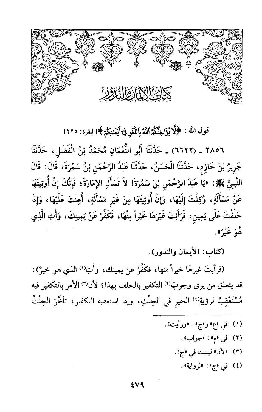 2856 - (6622) - حَدَّثَنَا أَبُو النُّعْمَانِ مُحَمَّدُ بْنُ الْفَضْلِ، حَدَّثَنَا جَرِيرُ بْنُ حَازِمٍ، حَدَّثَنَا الْحَسَنُ، حَدَّثَنَا عَبْدُ الرَّحْمَنِ بْنُ سَمُرَةَ، قَالَ: قَالَ النَّبِيُّ - صلى الله عليه وسلم -: "يَا عَبْدَ الرَّحْمَنِ بْنَ سَمُرَةَ! لَا تَسْأَلِ الإمَارَةَ؛ فَإِنَّكَ إِنْ أُوتِيتَهَا عَنْ مَسْأَلَةٍ، وُكِلْتَ إِلَيْهَا، وَإِنْ أُوتِيتَهَا مِنْ غَيْرِ مَسْأَلَةٍ، أُعِنْتَ عَلَيْهَا، وَإِذَا حَلَفْتَ عَلَى يَمِينٍ، فَرَأَيْتَ غَيْرَهَا خَيْراً مِنْهَا، فَكَفِّرْ عَنْ يَمِينِكَ، وَأْتِ الَّذِي هُوَ خَيْرٌ".