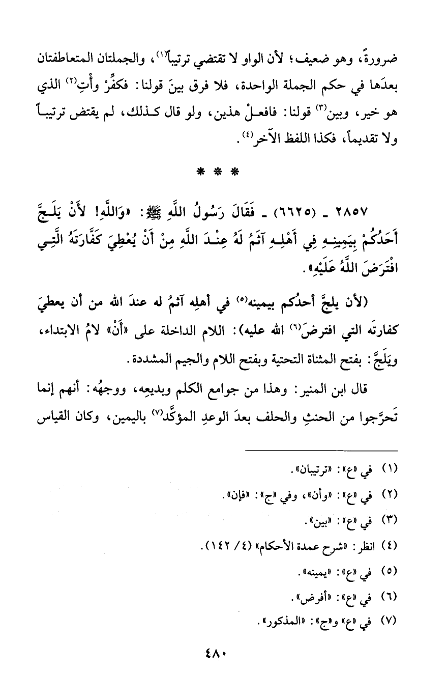 2857 - (6625) - فَقَالَ رَسُولُ اللهِ - صلى الله عليه وسلم -: "وَاللهِ! لأَنْ يَلَجَّ أَحَدُكُمْ بِيَمِينِهِ فِي أَهْلِهِ آثَمُ لَهُ عِنْدَ اللهِ مِنْ أَنْ يُعْطِيَ كَفَّارَتَهُ الَّتِي افْتَرَضَ اللهُ عَلَيْهِ".