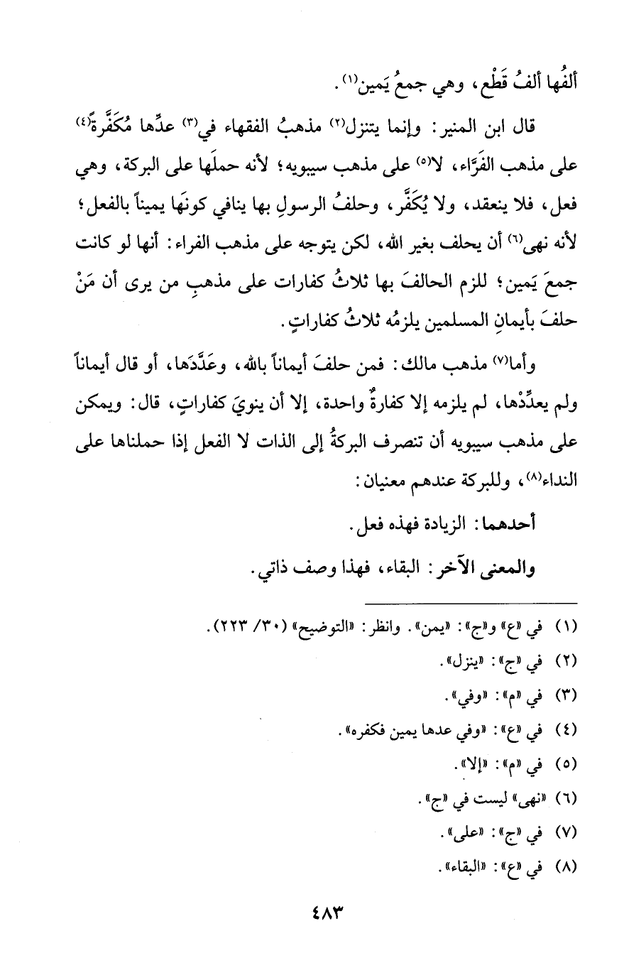 وأما (¬7) مذهب مالك: فمن حلفَ أيماناً بالله، وعَدَّدَها، أو قال أيماناً ولم يعدِّدْها، لم يلزمه إِلَّا كفارةٌ واحدة، إِلَّا أن ينويَ كفاراتٍ، قال: ويمكن على مذهب سيبويه أن تنصرف البركةُ إلى الذات لا الفعل إذا حملناها على النداء (¬8)، وللبركة عندهم معنيان: