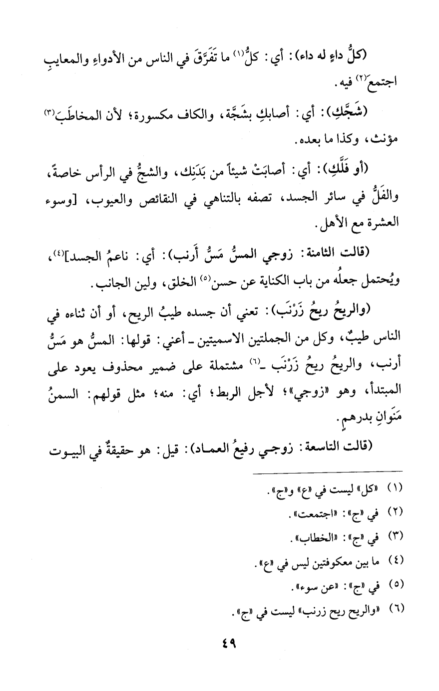 (والريحُ ريحُ زَرْنَب). تعني أن جسده طيبُ الريح، أو أن ثناءه في الناس طيبٌ، وكل من الجملتين الاسميتين -أعني: قولها: المسُّ هو مَسُّ أرنب، والريحُ ريحُ زَرْنَب- (¬6) مشتملة على ضمير محذوف يعود على المبتدأ، وهو "زوجي"؛ لأجل الربط؛ أي: منه؛ مثل قولهم: السمنُ مَنَوانِ بدرهمٍ.