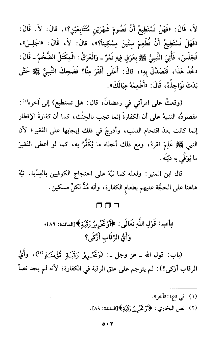 (¬2) نص البخاري: {أَوْ تَحْرِيرُ رَقَبَةٍ} [المائدة: 89].