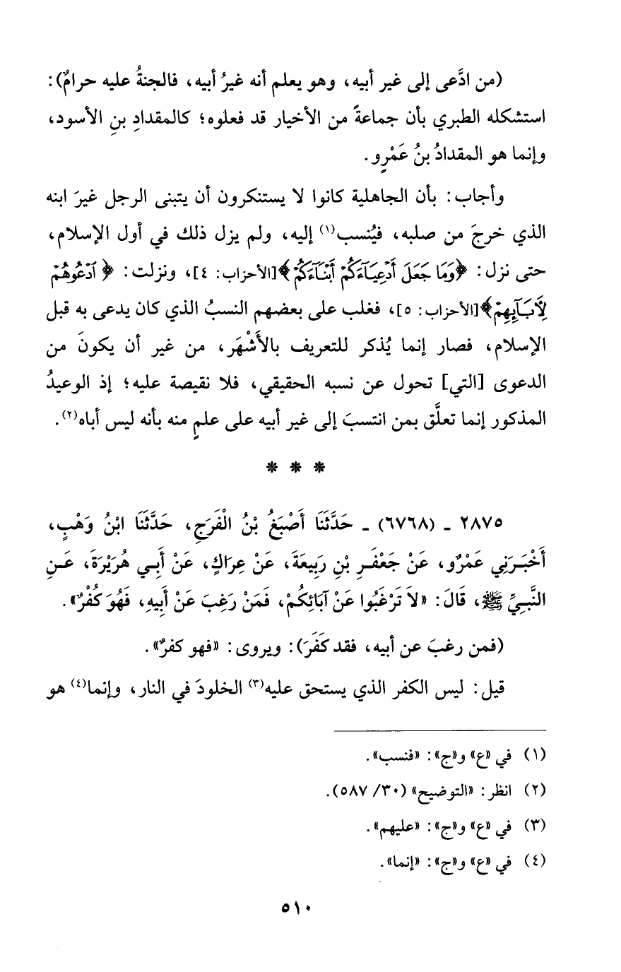2875 - (6768) - حَدَّثَنَا أَصْبَغُ بْنُ الْفَرَجِ، حَدَّثَنَا ابْنُ وَهْبٍ، أَخْبَرَنِي عَمْرٌو، عَنْ جَعْفَرِ بْنِ رَبِيعَةَ، عَنْ عِرَاكٍ، عَنْ أَبي هُرَيْرَةَ، عَنِ النَّبِيِّ - صلى الله عليه وسلم -، قَالَ: "لَا تَرْغَبُوا عَنْ آبَائِكُمْ، فَمَنْ رَغِبَ عَنْ أَبيهِ، فَهُوَ كُفْرٌ".