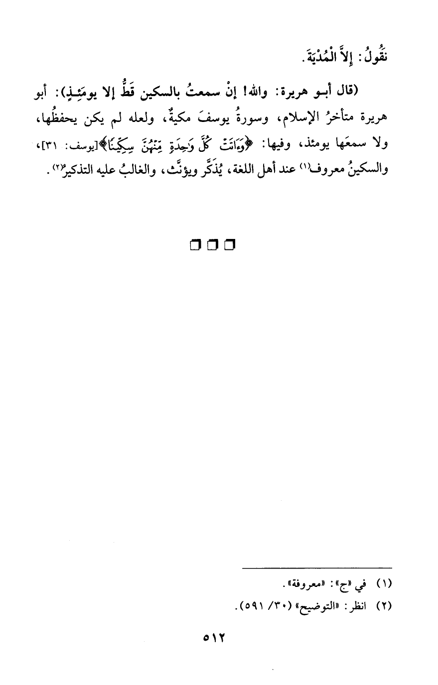 (قال أبو هريرة: والله! إنْ سمعتُ بالسكين قَطُّ إِلَّا يومَئِذٍ): أبو هريرة متأخرُ الإسلام، وسورةُ يوسفَ مكيةٌ، ولعله لم يكن يحفظُها، ولا سمعَها يومئذ، وفيها: {وَآتَتْ كُلَّ وَاحِدَةٍ مِنْهُنَّ سِكِّينًا} [يوسف: 31]، والسكينُ معروف (¬1) عند أهل اللغة، يُذَكَّر ويؤنَّث، والغالبُ عليه التذكيرُ (¬2).