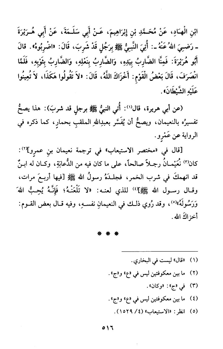 ابْنِ الْهَادِ، عَنْ مُحَمَّدِ بْنِ إِبْرَاهِيمَ، عَنْ أَبِي سَلَمَةَ، عَنْ أَبِي هُرَيْرَةَ - رَضِيَ اللهُ عَنْهُ -: أُتِيَ النَّبِيُّ - صلى الله عليه وسلم - بِرَجُلٍ قَدْ شَرِبَ، قَالَ: "اضْرِبُوه". قالَ أَبَو هُرَيْرَةَ: فَمِنَّا الضَّارِبُ بِيَدهِ، وَالضَّارِبُ بِنَعْلِهِ، وَالضَّارِبُ بِثَوْبِهِ، فَلَمَّا انْصَرَفَ، قَالَ بَعْضُ الْقَوْمِ: أَخْزَاكَ اللهُ، قَالَ: "لَا تَقُولُوا هَكَذَا، لَا تُعِينُوا عَلَيْهِ الشَّيْطَانَ".