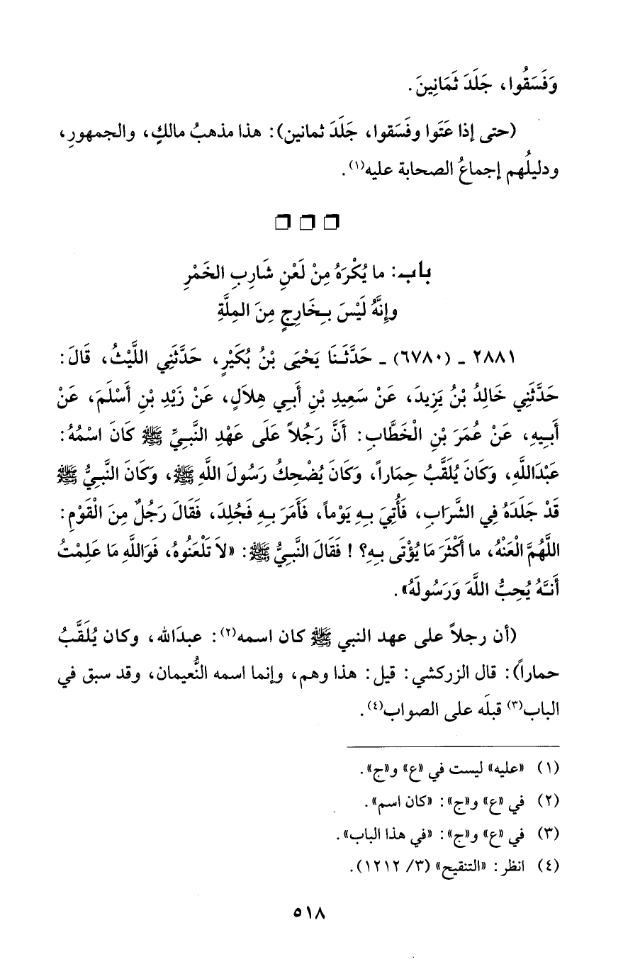 (أن رجلًا على عهد النبي - صلى الله عليه وسلم - كان اسمه (¬2): عبدَ الله، وكان يُلَقَّبُ حماراً): قال الزركشي: قيل: هذا وهم، وإنما اسمه النُّعيمان، وقد سبق في الباب (¬3) قبلَه على الصواب (¬4).