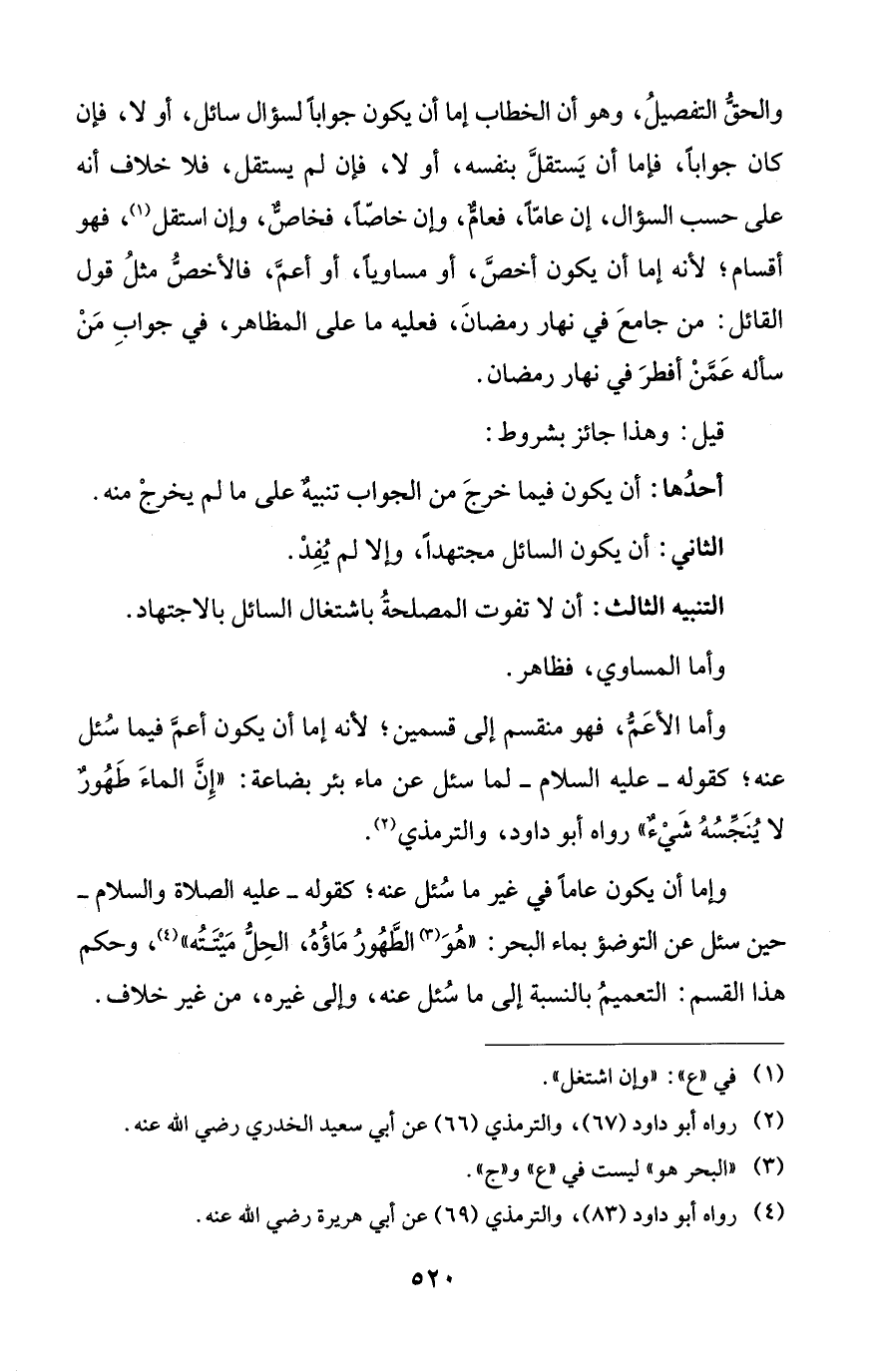 وإما أن يكون عاماً في غير ما سُئل عنه؛ كقوله - عليه الصلاة والسلام - حين سئل عن التوضؤ بماء البحر: "هُوَ (¬3) الطَّهُورُ مَاؤُهُ، الحِلُّ مَيْتَتُه" (¬4)، وحكم هذا القسم: التعميمُ بالنسبة إلى ما سُئل عنه، وإلى غيره، من غير خلاف.
