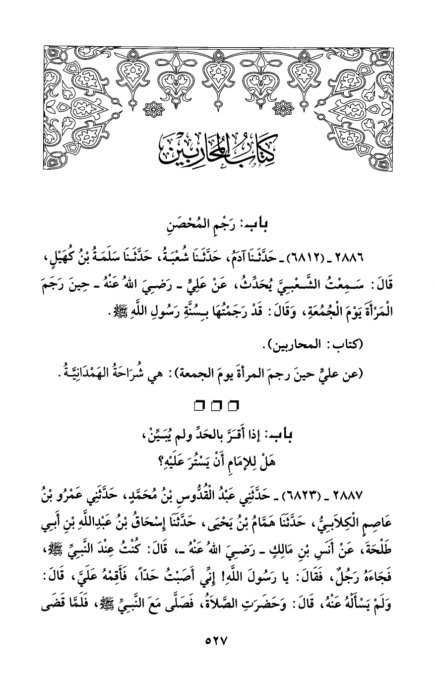 2886 - (6812) - حَدَّثَنَا آدَمُ، حَدَّثَنَا شُعْبَةُ، حَدَّثَنَا سَلَمَةُ بْنُ كُهَيْلٍ، قَالَ: سَمِعْتُ الشَّعْبِيَّ يُحَدِّثُ، عَنْ عَلِيٍّ - رَضِيَ اللهُ عَنْهُ - حِينَ رَجَمَ الْمَرْأَةَ يَوْمَ الْجُمُعَةِ، وَقَالَ: قَدْ رَجَمْتُهَا بِسُنَّةِ رَسُولِ اللهِ - صلى الله عليه وسلم -.