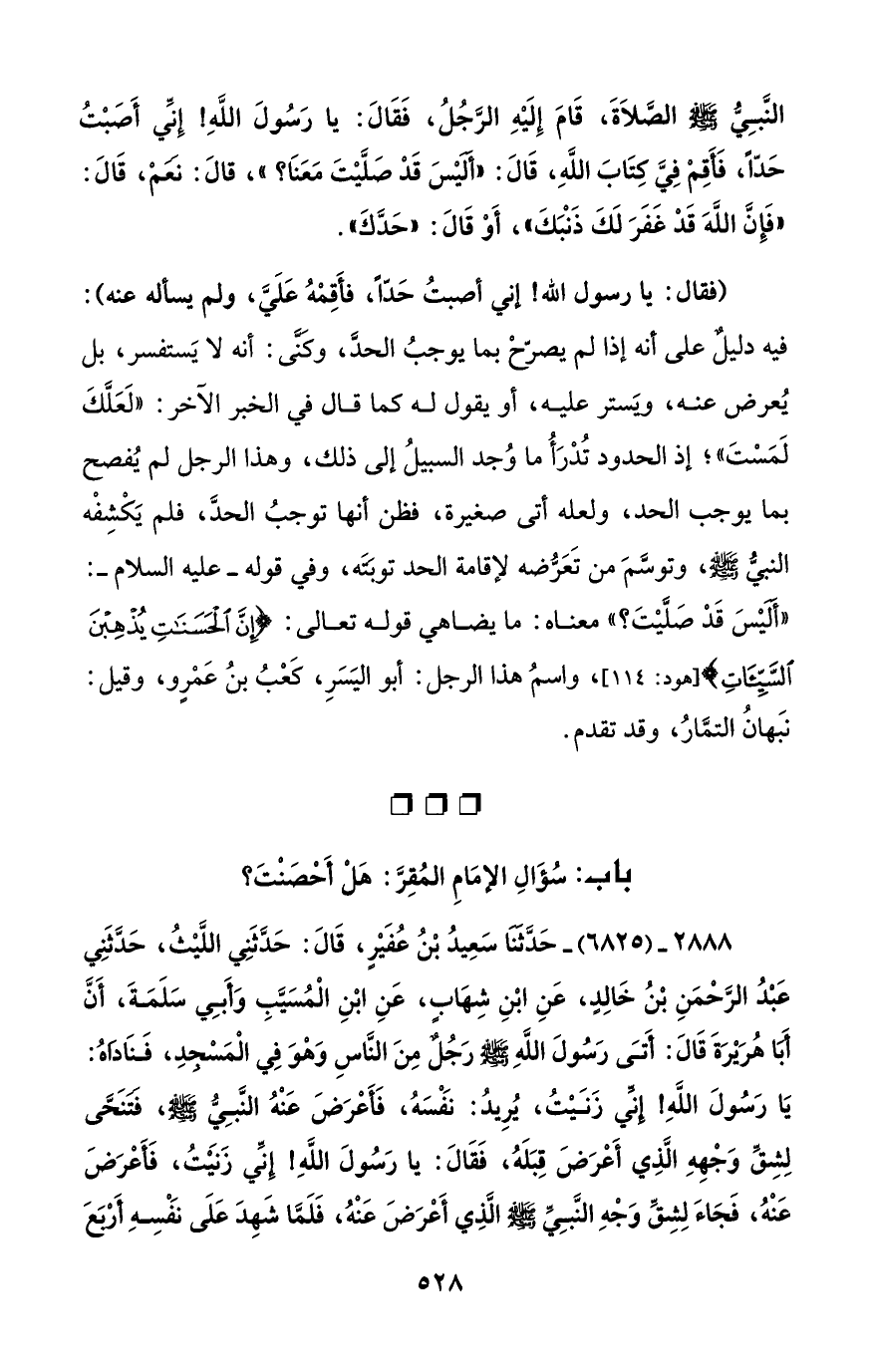 2888 - (6825) - حَدَّثَنَا سَعِيدُ بْنُ عُفَيْرٍ، قَالَ: حَدَّثَنِي اللَّيْثُ، حَدَّثَنِي عَبْدُ الرَّحْمَنِ بْنُ خَالِدٍ، عَنِ ابْنِ شِهَابٍ، عَنِ ابْنِ الْمُسَيَّبِ وَأَبِي سَلَمَةَ، أَنَّ أَبَا هُرَيْرَةَ قَالَ: أَتَى رَسُولَ اللهِ - صلى الله عليه وسلم - رَجُلٌ مِنَ النَّاسِ وَهْوَ فِي الْمَسْجدِ، فَنَادَاهُ: يَا رَسُولَ اللهِ! إِنِّي زَنَيْتُ، يُرِيدُ: نَفْسَهُ، فَأَعْرَضَ عَنْهُ النَّبِيُّ - صلى الله عليه وسلم -، فَتَنَحَّى لِشِقِّ وَجْهِهِ الَّذِي أَعْرَضَ قِبَلَهُ، فَقَالَ: يا رَسُولَ اللهِ! إنِّي زنيتُ، فَأَعْرَضَ عَنْهُ، فَجَاءَ لِشِقِّ وَجْهِ النَّبِيِّ - صلى الله عليه وسلم - الَّذِي أَعْرَضَ عَنْهُ، فَلَمَّا شَهِدَ عَلَى نَفْسِهِ أَرْبَعَ