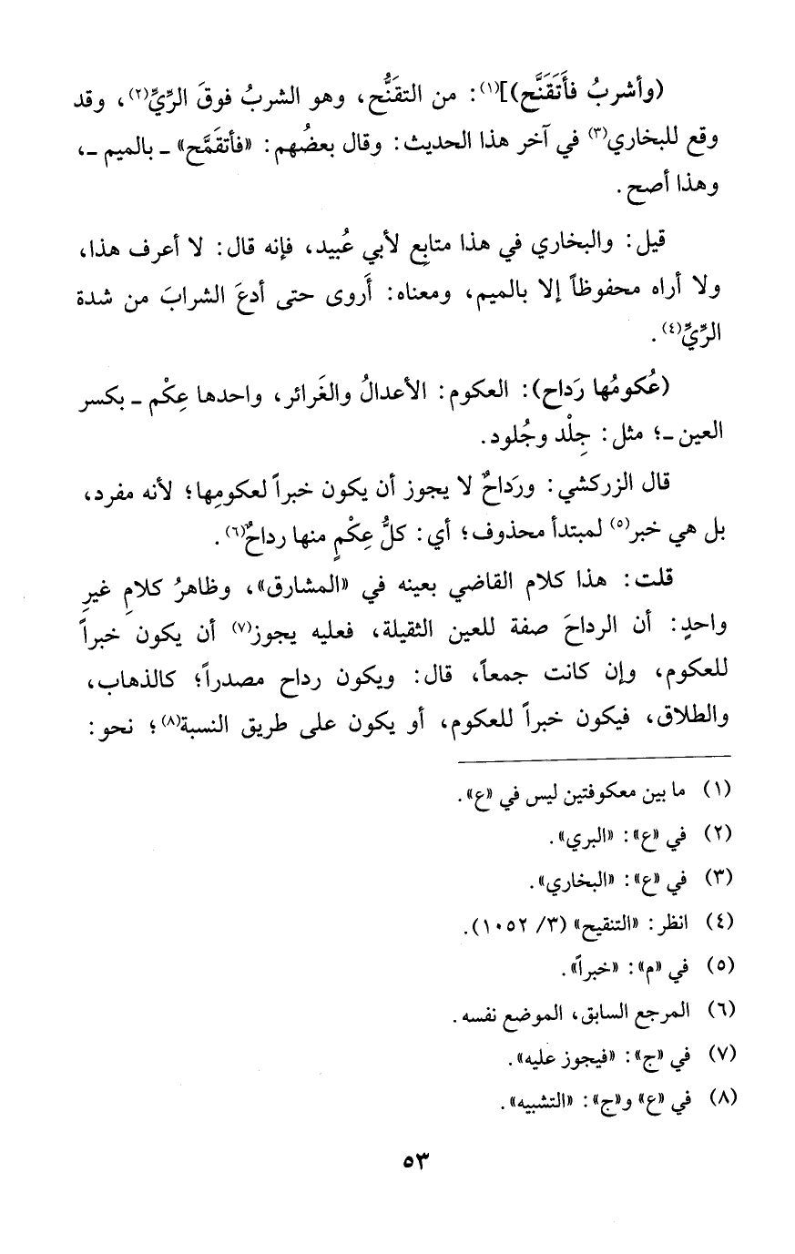 قلت: هذا كلام القاضي بعينه في "المشارق"، وظاهرُ كلامِ غيرِ واحدٍ: أن الرداحَ صفة للعين الثقيلة، فعليه يجوز (¬7) أن يكون خبرًا للعكوم، وإن كانت جمعًا، قال: ويكون رداح مصدرًا؛ كالذهاب، والطلاق، فيكون خبرًا للعكوم، أو يكون على طريق النسبة (¬8)؛ نحو: