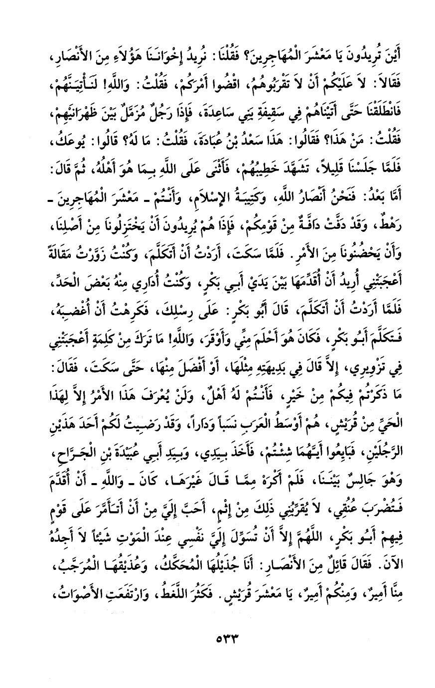 أَيْنَ تُرِيدُونَ يَا مَعْشَرَ الْمُهَاجِرِينَ؟ فَقُلْنَا: نُرِيدُ إِخْوَانَنَا هَؤُلَاءِ مِنَ الأَنْصَارِ، فَقَالَا: لَا عَلَيْكُمْ أَنْ لَا تَقْرَبُوهُمُ، اقْضُوا أَمْرَكُمْ، فَقُلْتُ: وَاللهِ! لَنَأْتِيَنَّهُمْ، فَانْطَلَقْنَا حَتَّى أَتَيْنَاهُمْ فِي سَقِيفَةِ بَنِي سَاعِدَةَ، فَإِذَا رَجُلٌ مُزَمَّلٌ بَيْنَ ظَهْرَانَيْهِمْ، فَقُلْتُ: مَنْ هَذَا؟ فَقَالُوا: هَذَا سَعْدُ بْنُ عُبَادَةَ، فَقُلْتُ: مَا لَهُ؟ قَالُوا: يُوعَكُ، فَلَمَّا جَلَسْنَا قَلِيلًا، تَشَهَّدَ خَطِيبُهُمْ، فَأَثْنَى عَلَى اللهِ بِمَا هُوَ أَهْلُهُ، ثُمَّ قَالَ: أَمَّا بَعْدُ: فَنَحْنُ أَنْصَارُ اللهِ، وَكَتِيبَةُ الإِسْلَامِ، وَأَنْتُمْ - مَعْشَرَ الْمُهَاجِرِينَ - رَهْطٌ، وَقَدْ دَفَّتْ دَافَّةٌ مِنْ قَوْمِكُمْ، فَإِذَا هُمْ يُرِيدُونَ أَنْ يَخْتَزِلُونَا مِنْ أَصْلِنَا، وَأَنْ يَحْضُنُونَا مِنَ الأَمْرِ. فَلَمَّا سَكَتَ، أَرَدْتُ أَنْ أَتَكَلَّمَ، وَكُنْتُ زَوَّرْتُ مَقَالَةً أَعْجَبَتْنِي أُرِيدُ أَنْ أُقَدِّمَهَا بَيْنَ يَدَيْ أَبِي بَكْرٍ، وَكُنْتُ أُدَارِي مِنْهُ بَعْضَ الْحَدِّ، فَلَمَّا أَرَدْتُ أَنْ أَتَكَلَّمَ، قَالَ أَبُو بَكْرٍ: عَلَى رِسْلِكَ، فَكَرِهْتُ أَنْ أُغْضِبَهُ، فَتَكَلَّمَ أَبُو بَكْرٍ، فَكَانَ هُوَ أَحْلَمَ مِنِّي وَأَوْقَرَ، وَاللهِ! مَا تَرَكَ مِنْ كَلِمَةٍ أَعْجَبَتْنِي فِي تَزْوِيرِي، إِلَّا قَالَ فِي بَدِيهَتِهِ مِثْلَهَا، أَوْ أَفْضَلَ مِنْهَا، حَتَّى سَكَتَ، فَقَالَ: مَا ذَكَرْتُمْ فِيكُمْ مِنْ خَيْرٍ، فَأَنْتُمْ لَهُ أَهْلٌ، وَلَنْ يُعْرَفَ هَذَا الأَمْرُ إِلَّا لِهَذَا الْحَيِّ مِنْ قُرَيْشٍ، هُمْ أَوْسَطُ الْعَرَبِ نَسَباً وَدَاراً، وَقَدْ رَضِيتُ لَكُمْ أَحَدَ هَذَيْنِ الرَّجُلَيْنِ، فَبَايِعُوا أَيَّهُمَا شِئْتُمْ، فَأَخَذَ بِيَدِي، وَبِيَدِ أَبِي عُبَيْدَةَ بْنِ الْجَرَّاحِ، وَهْوَ جَالِسٌ بَيْنَنَا، فَلَمْ أَكْرَهْ مِمَّا قَالَ غَيْرَهَا، كَانَ - وَاللهِ - أَنْ أُقَدَّمَ فَتُضْرَبَ عُنُقِي، لَا يُقَرِّبُنِي ذَلِكَ مِنْ إِثْمٍ، أَحَبَّ إِلَيَّ مِنْ أَنْ أَتَأَمَّرَ عَلَى قَوْمٍ فِيهِمْ أَبُو بَكْرٍ، اللَّهُمَّ إِلَّا أَنْ تُسَوِّلَ إِلَيَّ نَفْسِي عِنْدَ الْمَوْتِ شَيْئاً لَا أَجِدُهُ الآنَ. فَقَالَ قَائِلٌ مِنَ الأَنْصَارِ: أَنَا جُذَيْلُهَا الْمُحَكَّكُ، وَعُذَيْقُهَا الْمُرَجَّبُ، مِنَّا أَمِيرٌ، وَمِنْكُمْ أَمِيرٌ، يَا مَعْشَرَ قُرَيْشٍ. فَكَثُرَ اللَّغَطُ، وَارْتَفَعَتِ الأَصْوَاتُ،