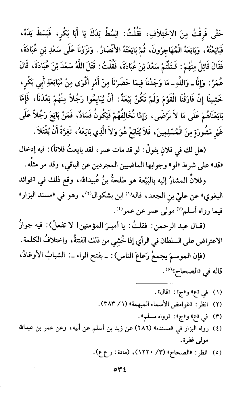 حَتَّى فَرِقْتُ مِنَ الاِخْتِلَافِ، فَقُلْتُ: ابْسُطْ يَدَكَ يَا أَبَا بَكْرٍ، فَبَسَطَ يَدَهُ، فَبَايَعْتُهُ، وَبَايَعَهُ الْمُهَاجِرُونَ، ثُمَّ بَايَعَتْهُ الأَنْصَارُ. وَنَزَوْنَا عَلَى سَعْدِ بْنِ عُبَادَةَ، فَقَالَ قَائِلٌ مِنْهُمْ: قَتَلْتُمْ سَعْدَ بْنَ عُبَادَةَ، فَقُلْتُ: قَتَلَ اللهُ سَعْدَ بْنَ عُبَادَةَ، قَالَ عُمَرُ: وَإِنَّا - وَاللهِ - مَا وَجَدْنَا فِيمَا حَضَرْنَا مِنْ أَمْرٍ أَقْوَى مِنْ مُبَايَعَةِ أَبِي بَكْرٍ، خَشِينَا إِنْ فَارَقْنَا الْقَوْمَ وَلَمْ تَكُنْ بَيْعَةٌ: أَنْ يُبَايِعُوا رَجُلًا مِنْهُمْ بَعْدَنَا، فَإِمَّا بَايَعْنَاهُمْ عَلَى مَا لَا نَرْضَى، وَإِمَّا نُخَالِفُهُمْ فَيَكُونُ فَسَادٌ، فَمَنْ بَايَعَ رَجُلًا عَلَى غَيْرِ مَشُورَةٍ مِنَ الْمُسْلِمِينَ، فَلَا يُتَابَعُ هُوَ وَلَا الَّذِي بَايَعَهُ، تَغِرَّةً أَنْ يُقْتَلَا.