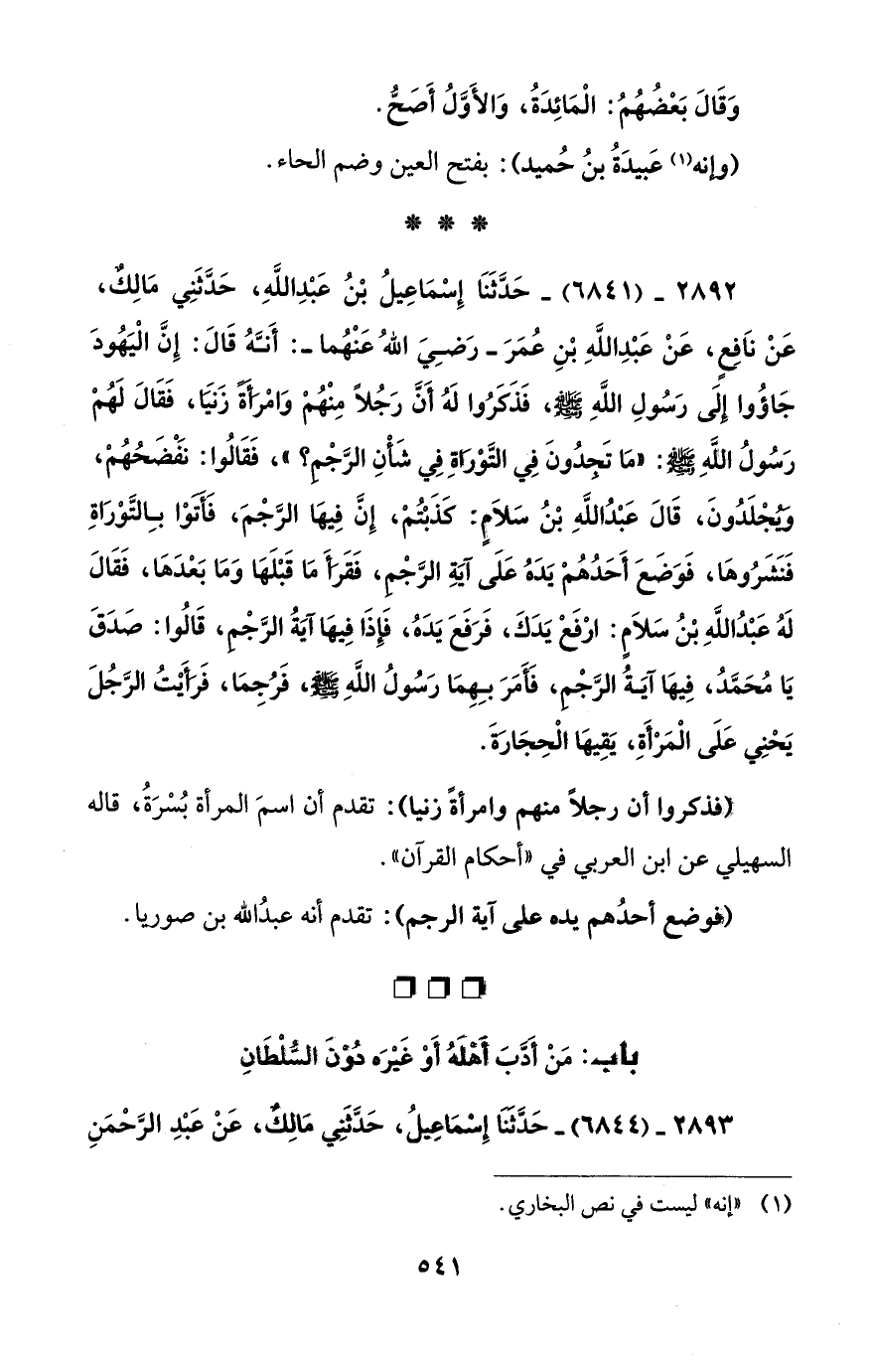 2892 - (6841) - حَدَّثَنَا إِسْمَاعِيلُ بْنُ عَبْدِ اللهِ، حَدَّثَنِي مَالِكٌ، عَنْ نَافِعٍ، عَنْ عَبْدِ اللهِ بْنِ عُمَرَ - رَضِيَ اللهُ عَنْهُما -: أَنَّهُ قَالَ: إِنَّ الْيَهُودَ جَاؤُوا إِلَى رَسُولِ اللهِ - صلى الله عليه وسلم -، فَذَكَرُوا لَهُ أَن رَجُلًا مِنْهُمْ وَامْرأَةً زنَيَا، فَقَالَ لَهُمْ رَسُولُ اللهِ - صلى الله عليه وسلم -: "مَا تَجِدُونَ فِي التَّوْرَاةِ فِي شَأْنِ الرَّجْمِ؟ "، فَقَالُوا: نفضَحُهُمْ، وَيُجْلَدُونَ، قَالَ عَبْدُ اللهِ بْنُ سَلَامٍ - كَذَبْتُمْ، إِنَّ فِيهَا الرَّجْمَ، فَأَتُوْا بِالتَّوْرَاةِ فَنَشَرُوهَا، فَوَضَعَ أَحَدُهُمْ يَدَهُ عَلَى آيَةِ الرَّجْمِ، فَقَرأَ مَا قَبْلَهَا وَمَا بَعْدَهَا، فَقَالَ لَهُ عَبْدُ اللهِ بْنُ سَلَامٍ: ارْفَعْ يَدَكَ، فَرَفَعَ يَدَهُ، فَإِذَا فِيهَا آيَةُ الرَّجْمِ، قَالُوا: صَدَقَ يَا مُحَمَّدُ، فِيهَا آيَةُ الرَّجْمِ، فَأَمَرَ بِهِمَا رَسُولُ اللهِ - صلى الله عليه وسلم -، فَرُجِمَا، فَرَأيْتُ الرَّجُلَ يَحْنِي عَلَى الْمَرْأَةِ، يَقِيهَا الْحِجَارَةَ.