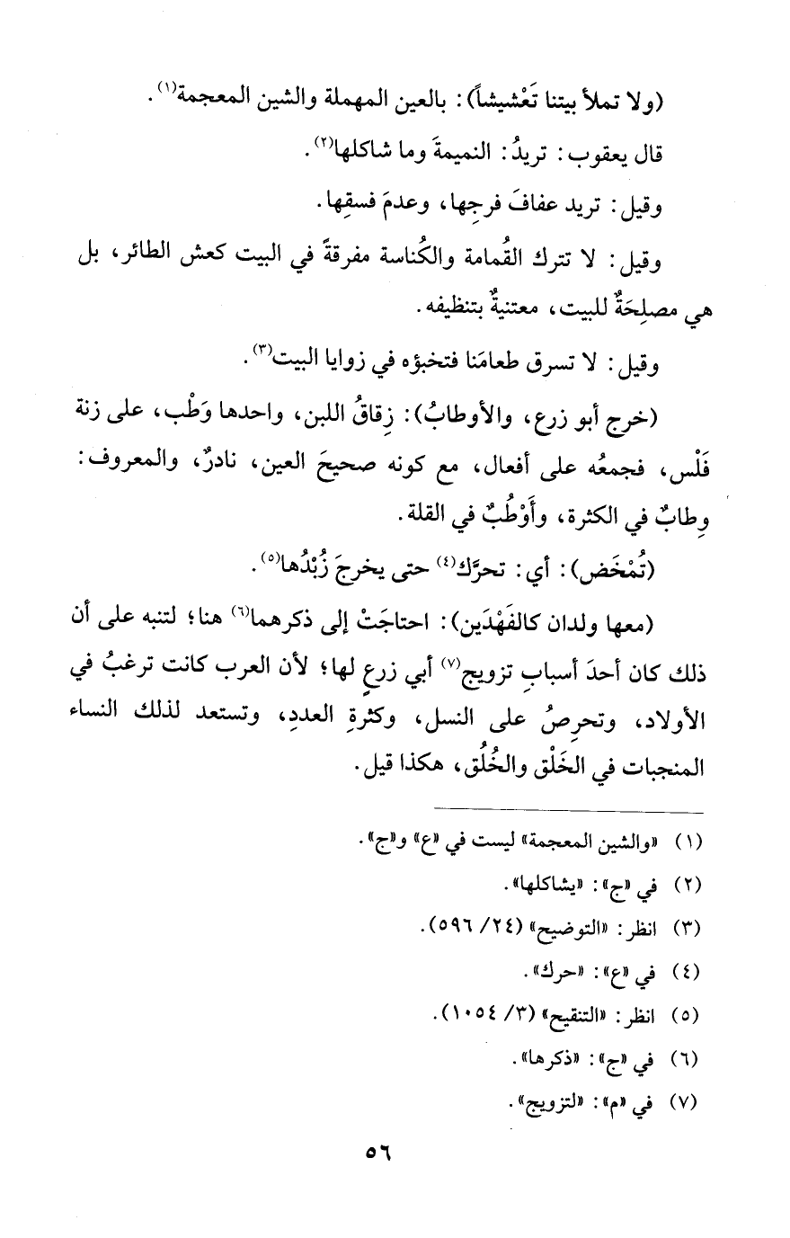 وقيل: لا تترك القُمامة والكُناسة مفرقةً في البيت كعش الطائر، بل هي مصلِحَةٌ للبيت، معتنيةٌ بتنظيفه.