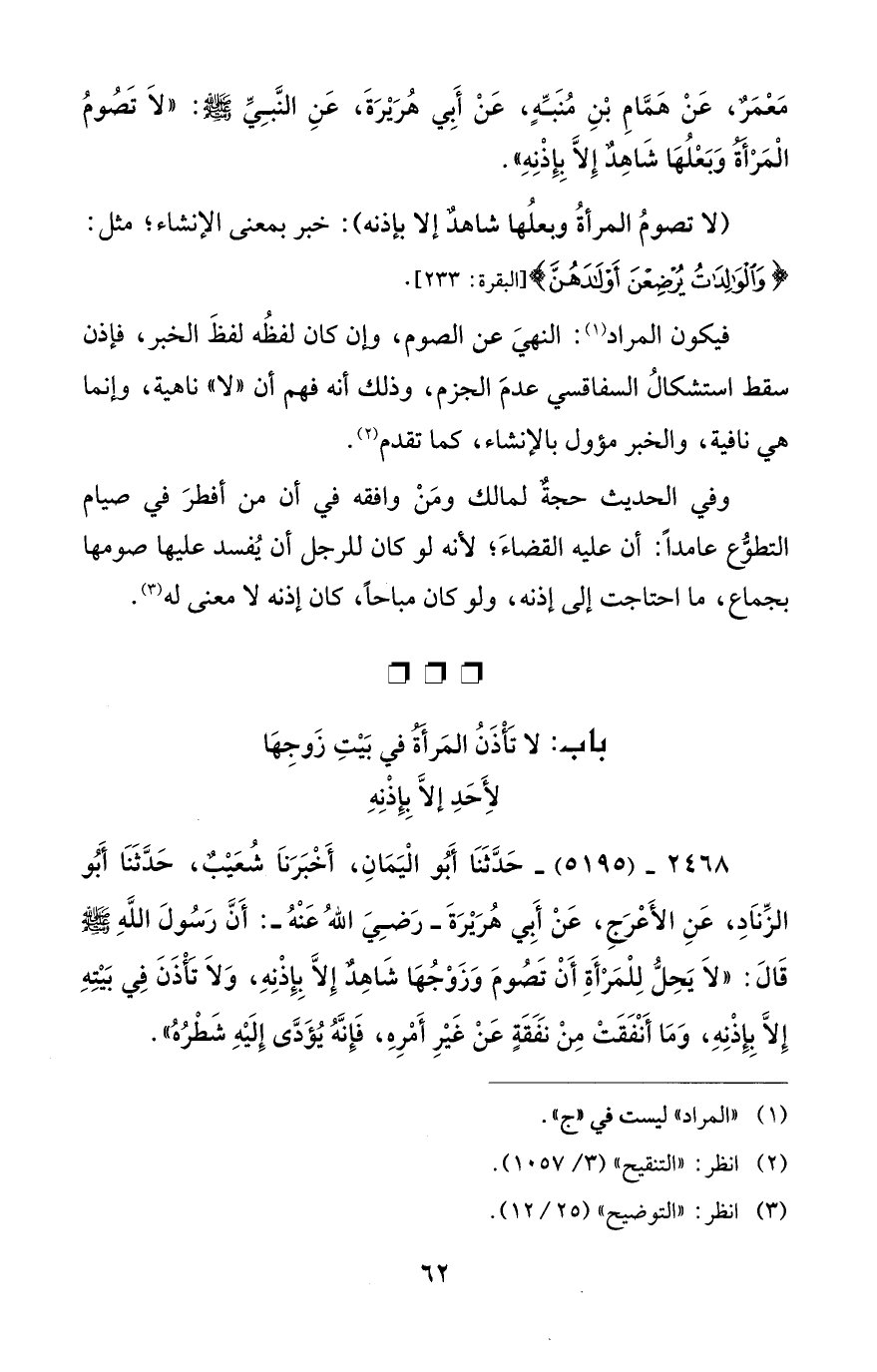 2468 - (5195) - حَدَّثَنَا أَبُو الْيَمَانِ، أَخْبَرَنَا شُعَيْبٌ، حَدَّثَنَا أَبُو الزِّنَادِ، عَنِ الأَعْرَجِ، عَنْ أَبي هُرَيْرَةَ - رضي الله عنه -: أَنَّ رَسُولَ اللَّهِ - صلى الله عليه وسلم - قَالَ: "لَا يَحِلُّ لِلْمَرْأَةِ أَنْ تَصُومَ وَزَوْجُهَا شَاهِدٌ إِلَّا بِإِذْنِهِ، وَلَا تَأْذَنَ فِي بَيْتِهِ إِلَّا بِإِذْنِهِ، وَمَا أَنْفَقَتْ مِنْ نَفَقَةٍ عَنْ غَيْرِ أَمْرِهِ، فَإِنَّهُ يُؤَدَّى إِلَيْهِ شَطْرُهُ".
