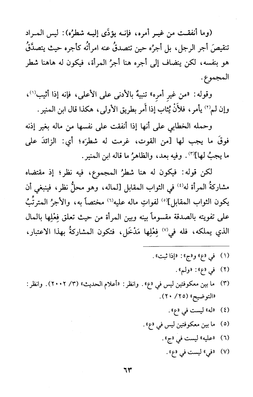 لكن قوله: فيكون له هنا شطرُ المجموع، فيه نظر؛ إذ مقتضاه مشاركةُ المرأة له (¬4) في الثواب المقابل [لماله، وهو محلُّ نظر، فينبغي أن يكون الثواب المقابل] (¬5) لفواتِ ماله عليه (¬6) مختصًا به، والأجرُ المترتِّبُ على تفويته بالصدقة مقسومًا بينه وبين المرأة من حيث تعلق فِعْلِها بالمال الذي يملكه، فله في (¬7) فِعْلِها مَدْخَل، فتكون المشاركةُ بهذا الاعتبار،