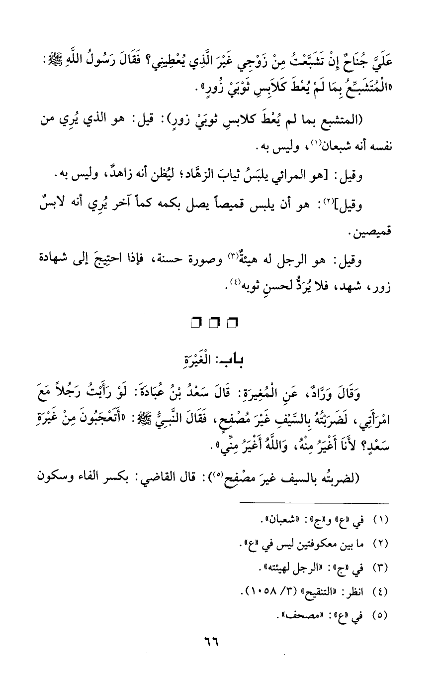 وَقَالَ وَرَّادٌ، عَنِ الْمُغِيرَةِ: قَالَ سَعْدُ بْنُ عُبَادَةَ: لَوْ رَأَيْتُ رَجُلًا مَعَ امْرَأَتِي، لَضَرَبْتُهُ بِالسَّيْفِ غَيْرَ مُصْفِحٍ، فَقَالَ النَّبِيُّ - صلى الله عليه وسلم -: "أَتَعْجَبُونَ مِنْ غَيْرَةِ سَعْدٍ؟ لأَنَا أَغْيَرُ مِنْهُ، وَاللَّهُ أَغْيَرُ مِنِّي".
