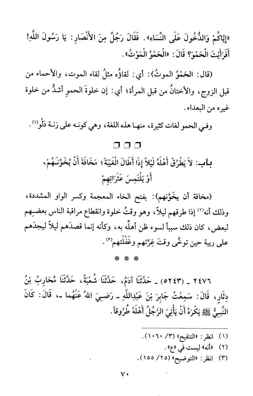 "إِيَّاكُمْ وَالدُّخُولَ عَلَى النِّسَاءِ". فَقَالَ رَجُلٌ مِنَ الأَنْصَارِ: يَا رَسُولَ اللَّهِ! أَفَرَأَيْتَ الْحَمْوَ؟ قَالَ: "الْحَمْوُ الْمَوْتُ".